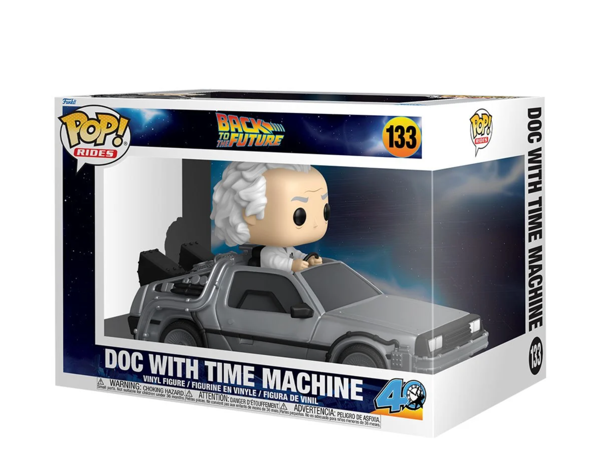 This Back to the Future 40th Anniversary Doc with Time Machine Deluxe Funko Pop! Ride measures approximately 5 1/4-inches tall and comes packaged in a window display box.