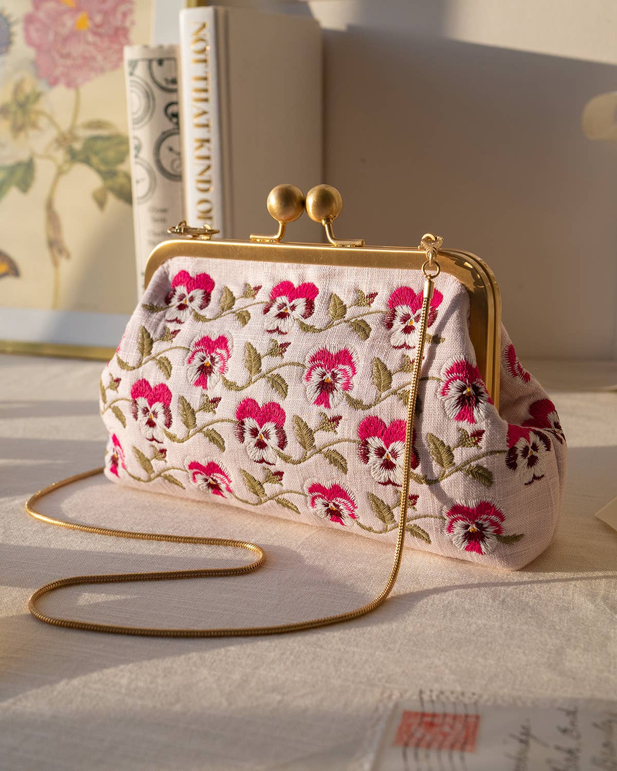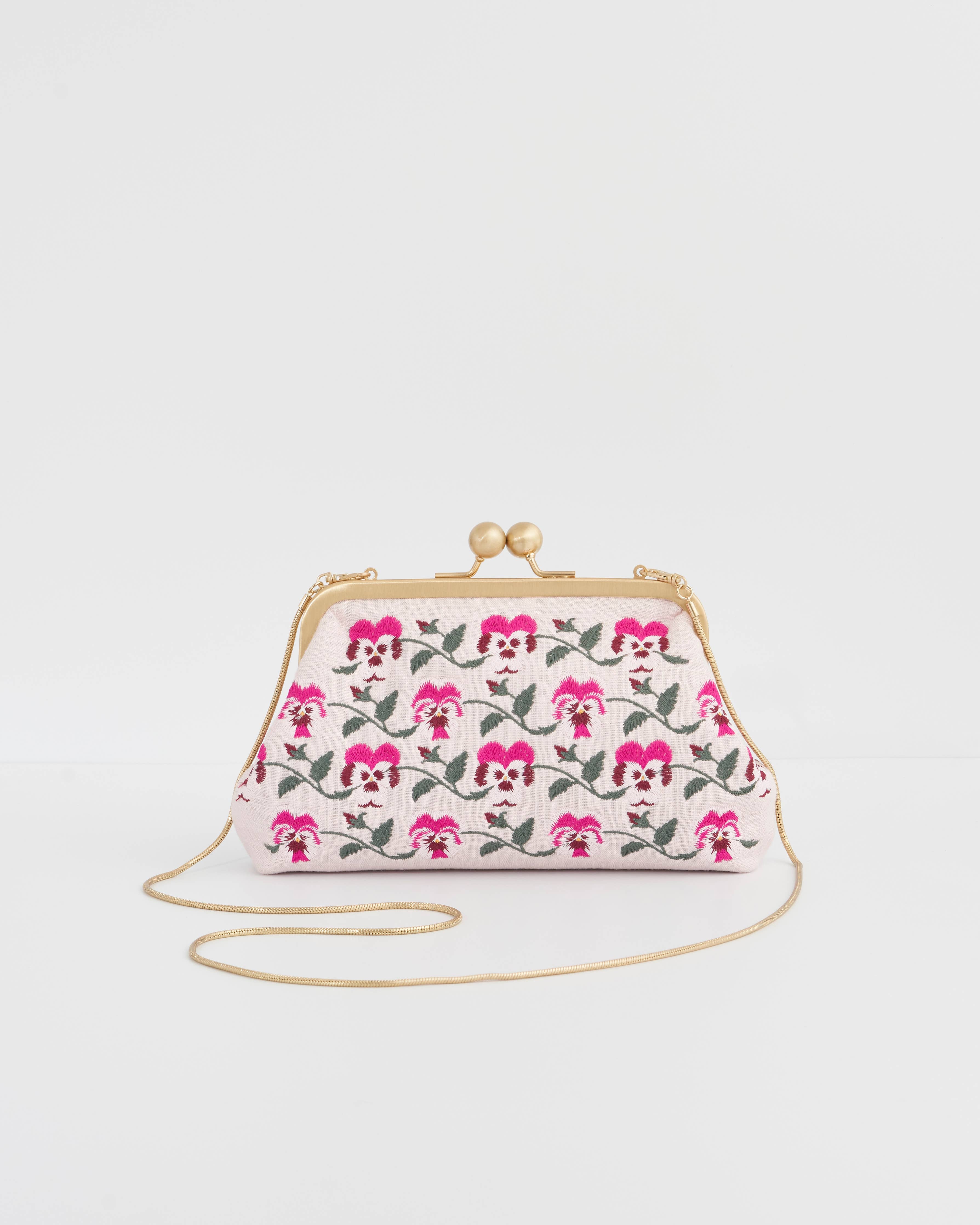 Elevate your next gathering with this stunning vintage-inspired clutch that flawlessly combines elegance and charm. Adorned with intricately embroidered pansies, each detail is carefully crafted to showcase the delicate beauty of these flowers. The captivating design is complemented by a secure kiss-lock clasp, adding a touch of nostalgia and sophistication. For versatility and convenience, it comes with a removable chain strap, allowing you to effortlessly transition from a clutch to a shoulder bag as the occasion demands.