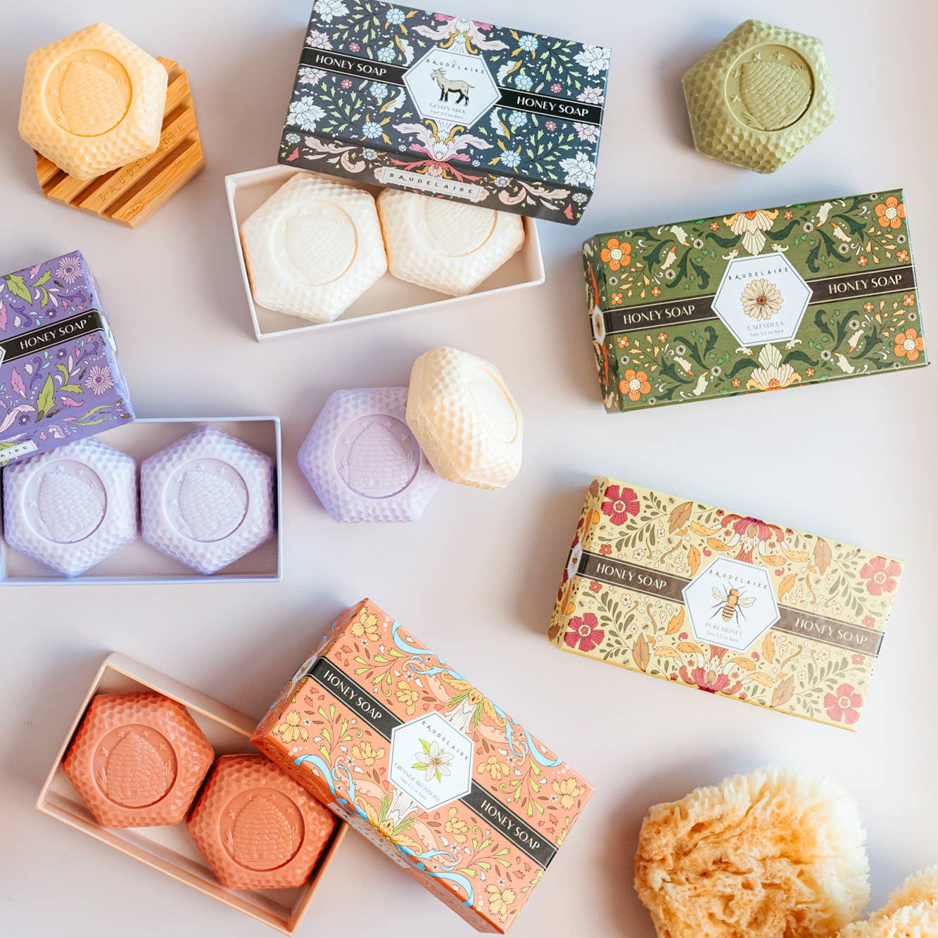 For over 30 years, Baudelaire Honey Soaps have brought joy to customers of all ages, and now, they feature refreshed packaging adorned with richly illustrated designs inspired by modern folk art. Available in six delightful fragrances, these soaps are the perfect way to treat yourself or give as a gift to someone special.
