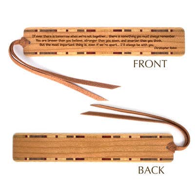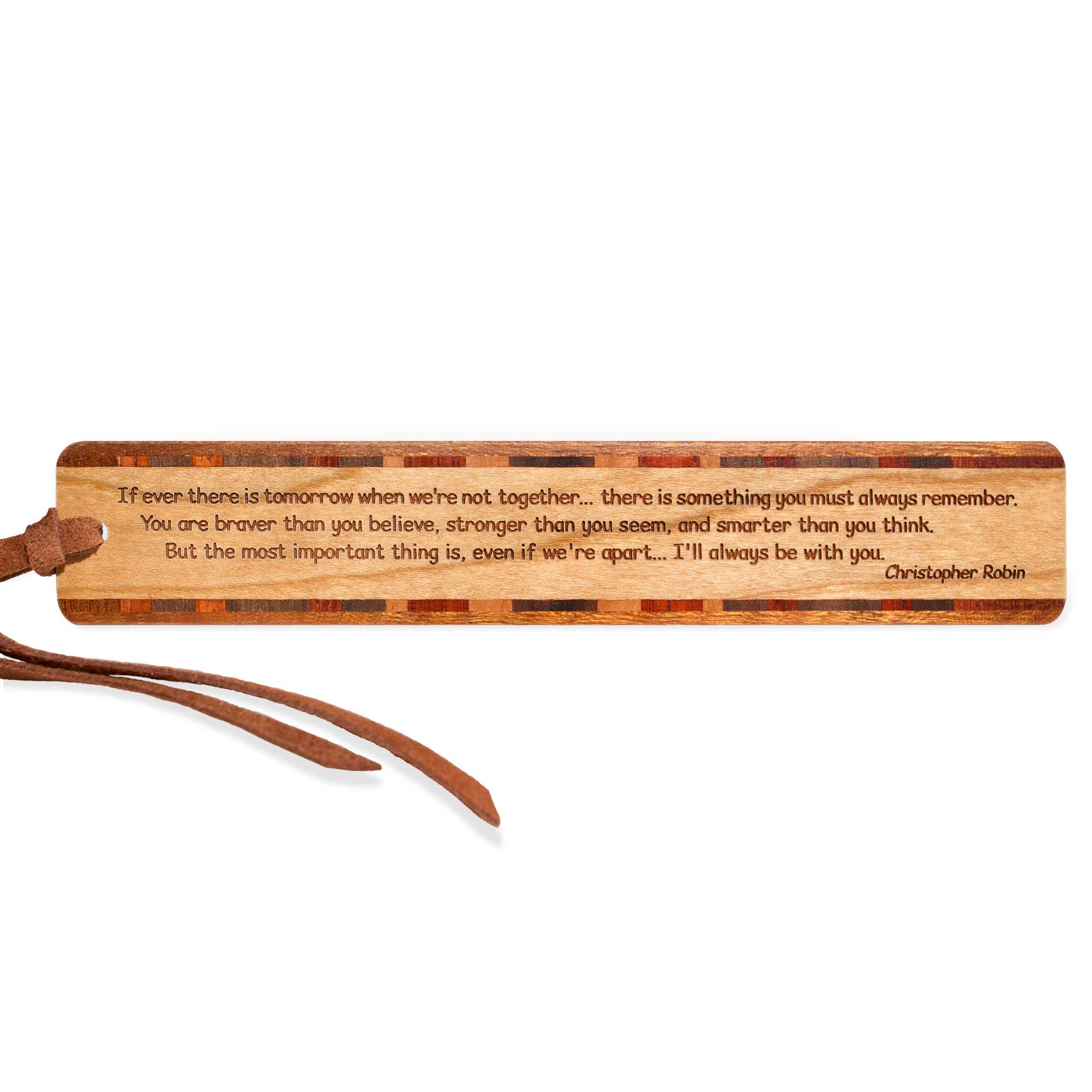 This bookmark features the heartwarming words of Christopher Robin, beautifully engraved onto a laminated hardwood surface with striking multi-grain patterns. The message reminds readers of inner strength and the enduring bond of love, making it an ideal gift for someone special.