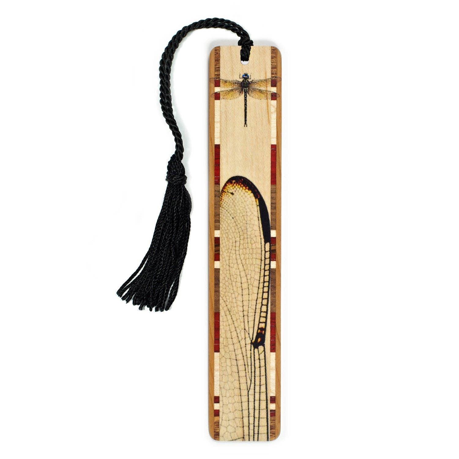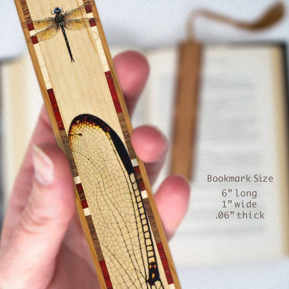 Handmade from the finest high-grade, hand-selected sustainable hardwoods, this bookmark features the stunning natural grain of maple at its center, bordered on both sides by intricately accented inlays crafted from a variety of domestic and exotic hardwoods. These unique inlay combinations will vary, ensuring each bookmark is one-of-a-kind. Our original dragonfly design is printed on the front using brilliant, non-fading color ink, creating a vibrant and lasting impression. The backside of the bookmark is left blank to highlight the beauty of the natural maple wood grain.