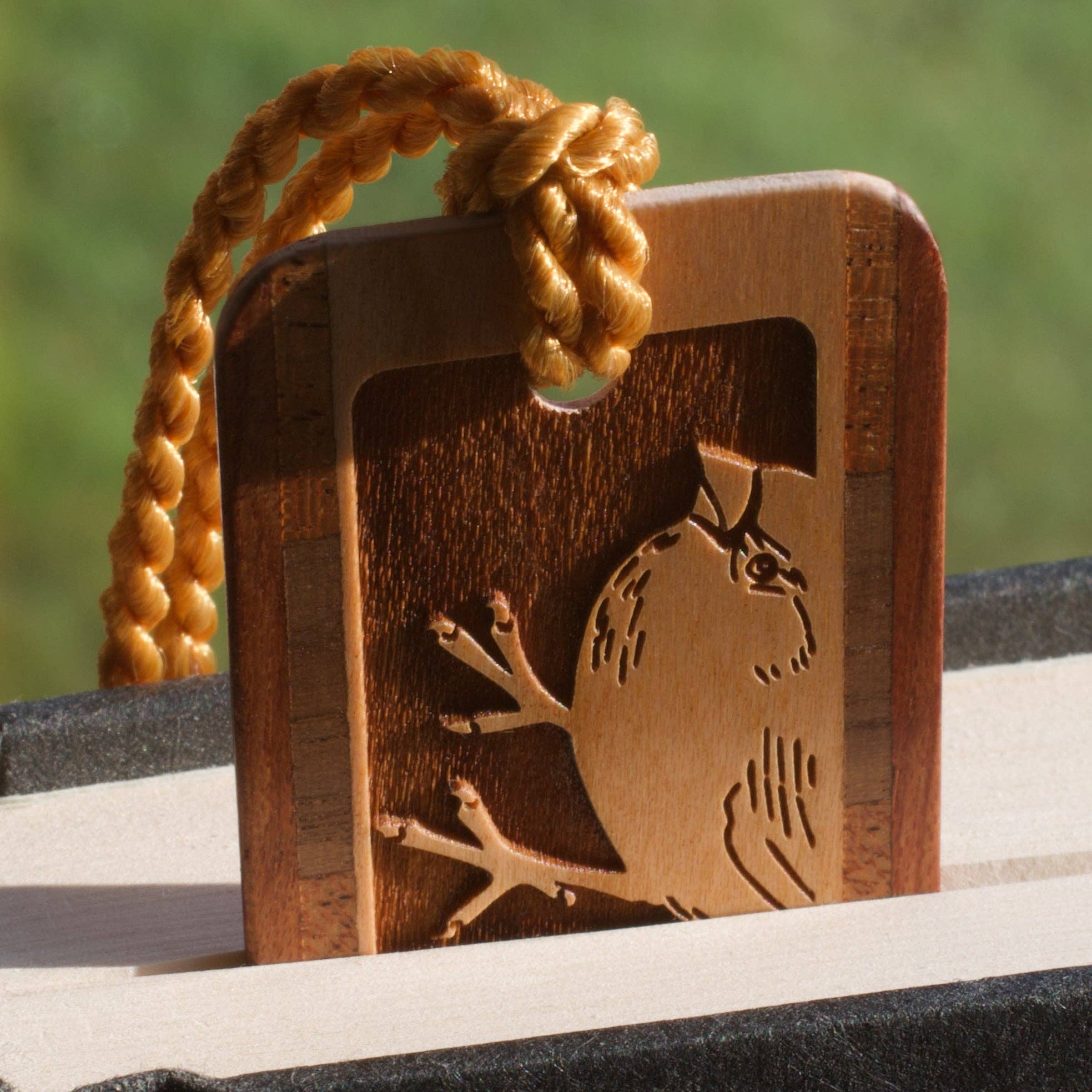 Handmade from the finest high-grade hand-selected sustainable hardwoods, this bookmark showcases the natural beauty of cherry wood at its center, bordered by intricately accented inlays crafted from a variety of wood combinations. The laser engraving features an original "Feeding Chickadees" design, capturing a heartwarming moment of nature’s charm on one side. The back side of the bookmark is left blank to highlight the beautiful cherry wood grain. A soft braided tassel is added as a finishing touch. Perfect for bird lovers and book enthusiasts, this elegant bookmark makes a thoughtful and eco-friendly gift.