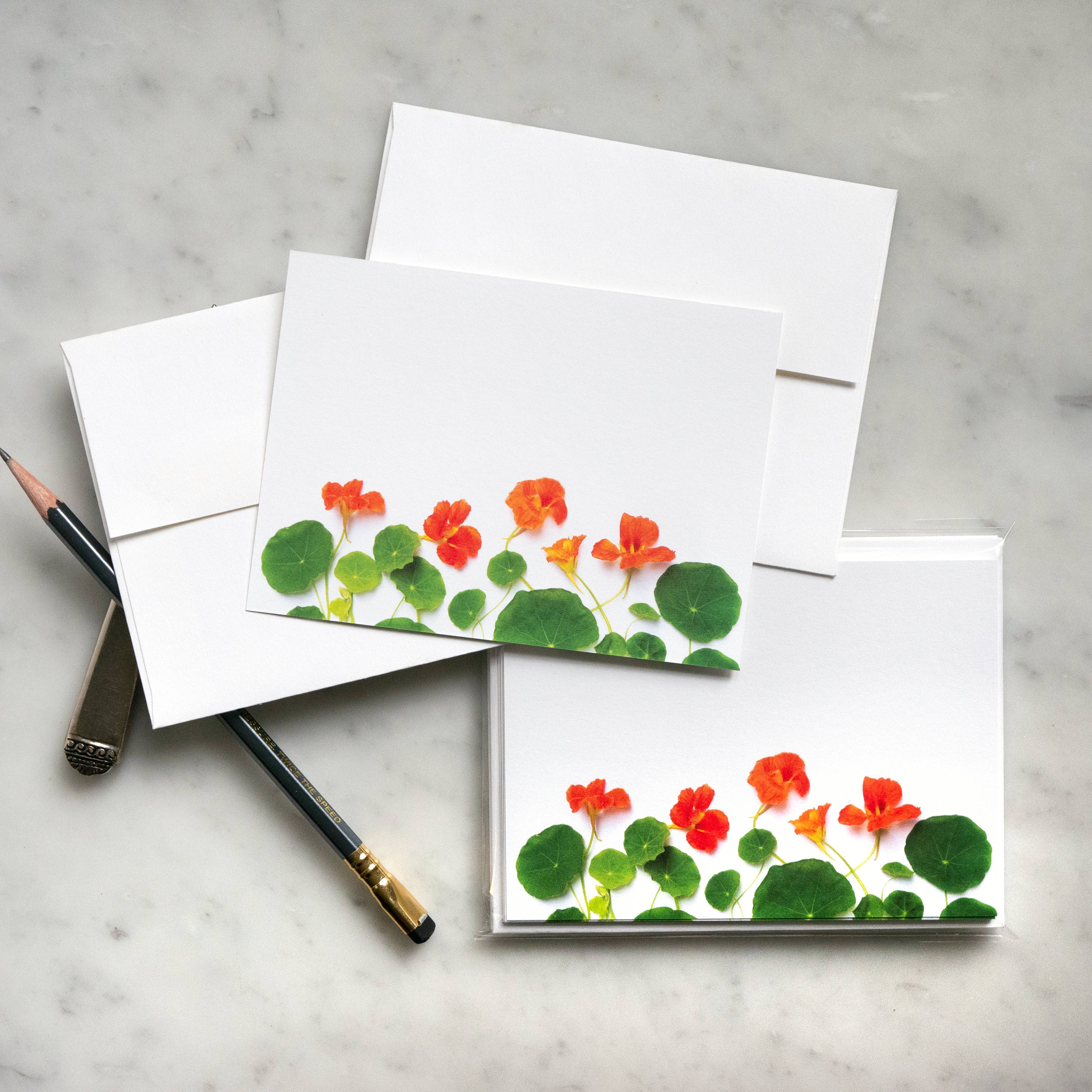 Set of eight flat botanical cards featuring orange nasturtium flowers and their quirky leaves. Printed on an appealingly soft and hefty card stock. Flat, not folding, design is perfect for the quick, casual notes.