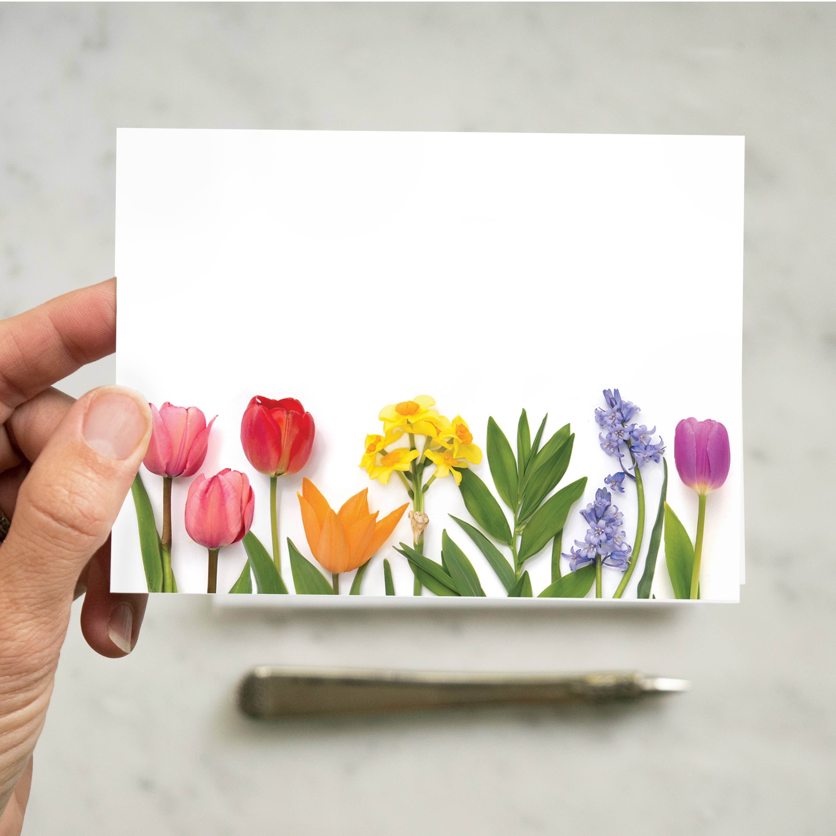 Set of eight flat botanical cards featuring a rainbow of spring flowers - tulips, daffodils, and bluebells. Printed on an appealingly soft and hefty card stock. Flat, not folding, design is perfect for the quick, casual notes of today.