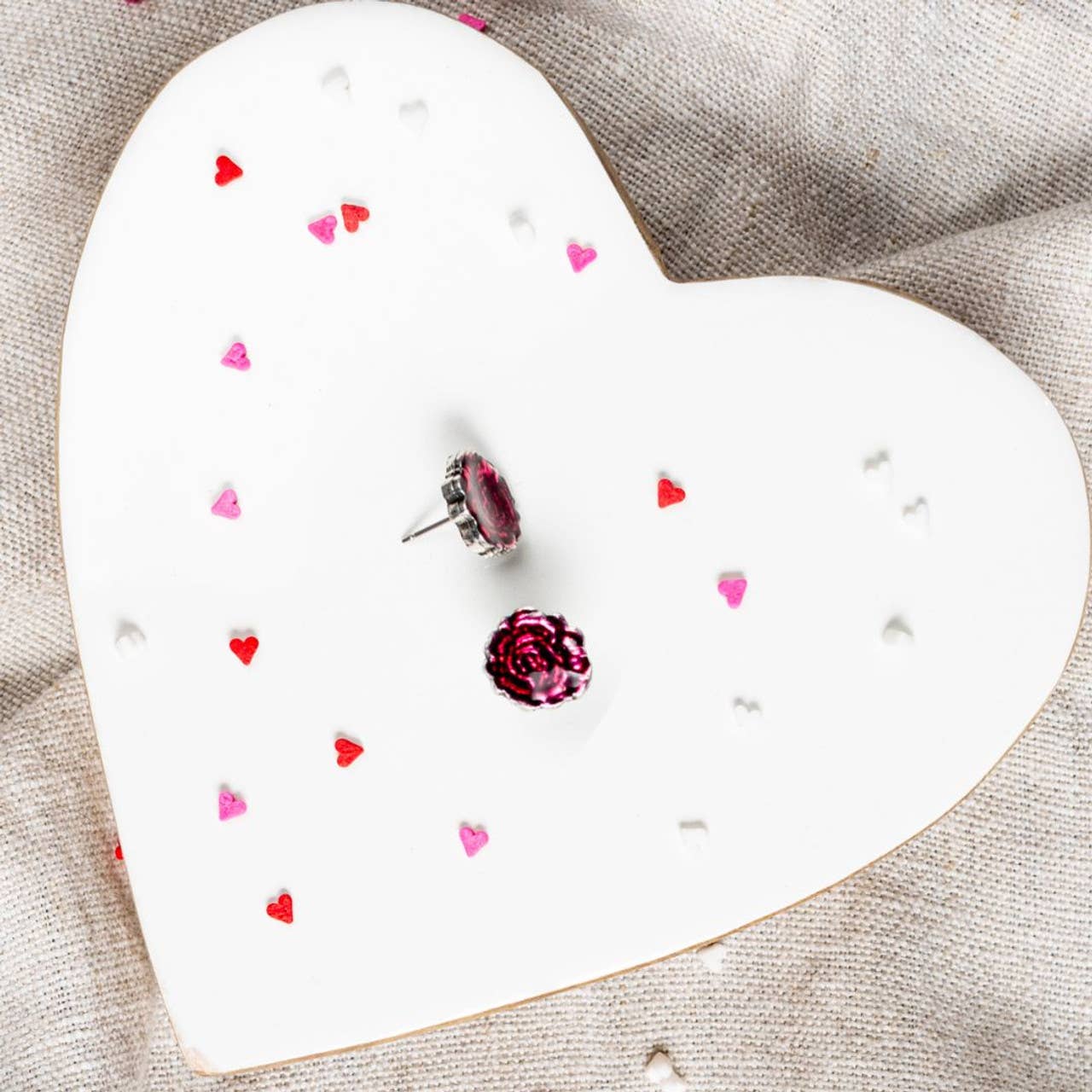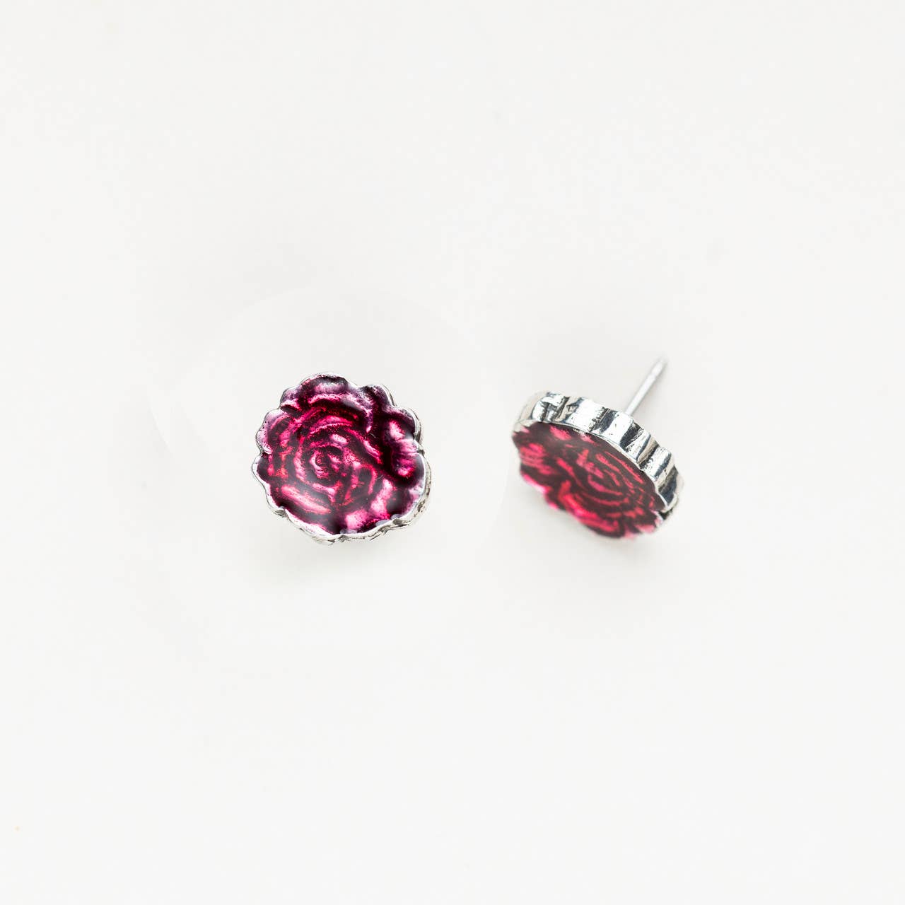 The Rosette / Red Mini Post Earrings feature a delicate rosette design in a rich, deep pink hue, these handcrafted pewter studs bring a subtle pop of color to any look. Perfect for everyday wear or special occasions, their classic design makes them a thoughtful gift or a lovely addition to your own collection.