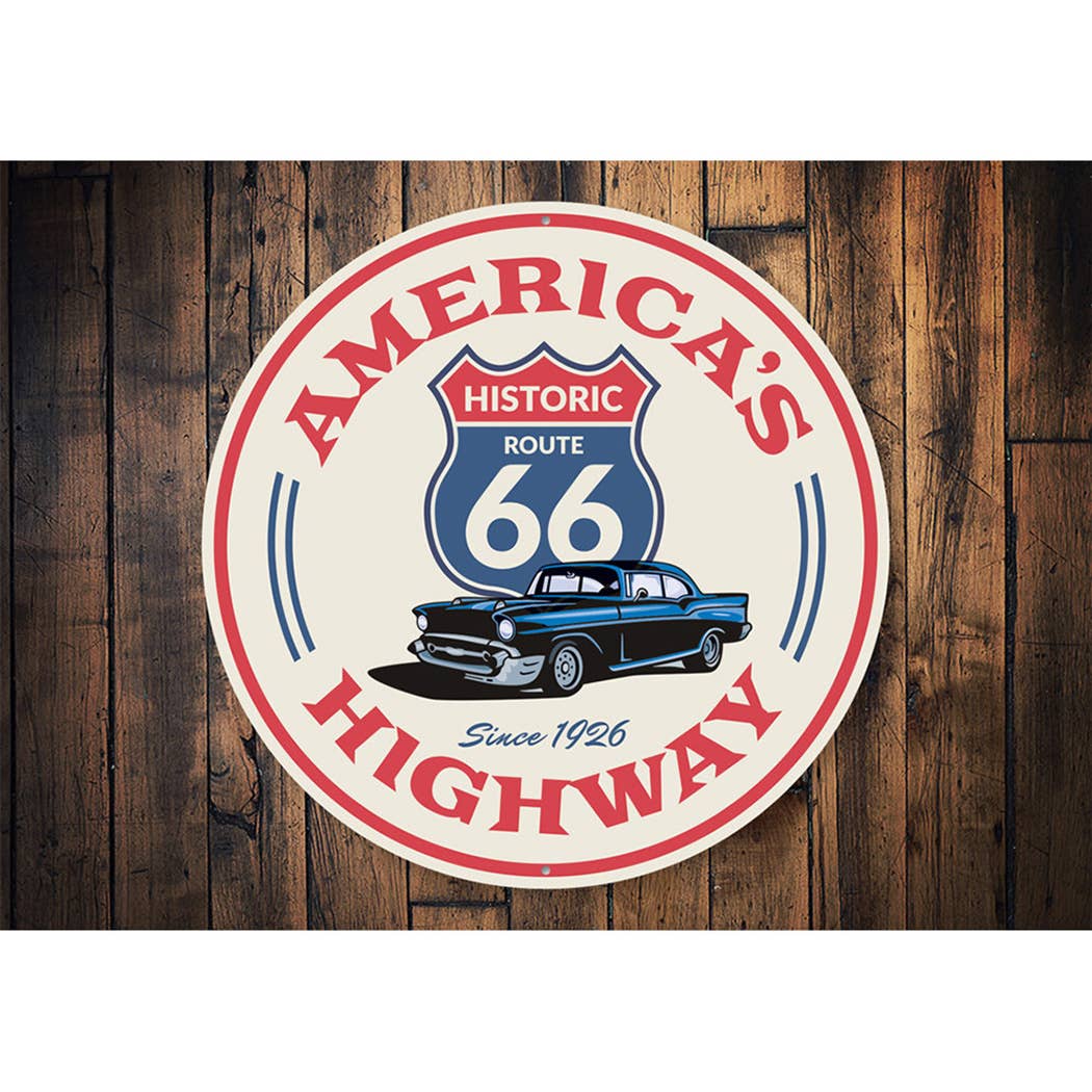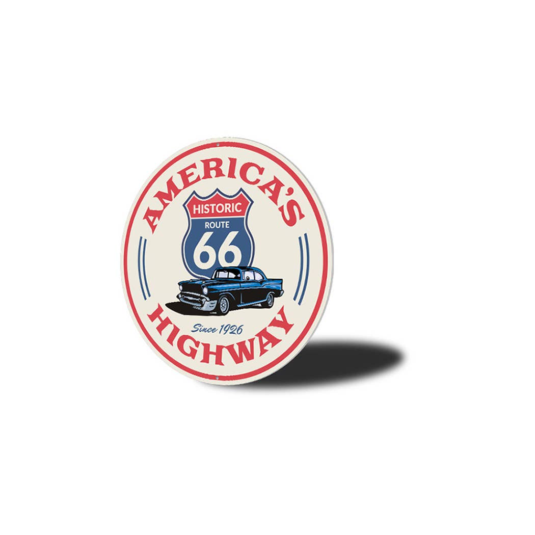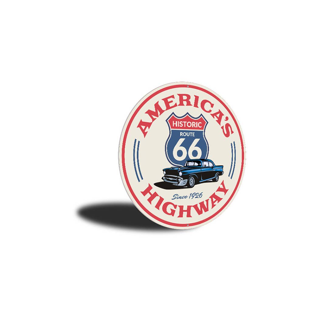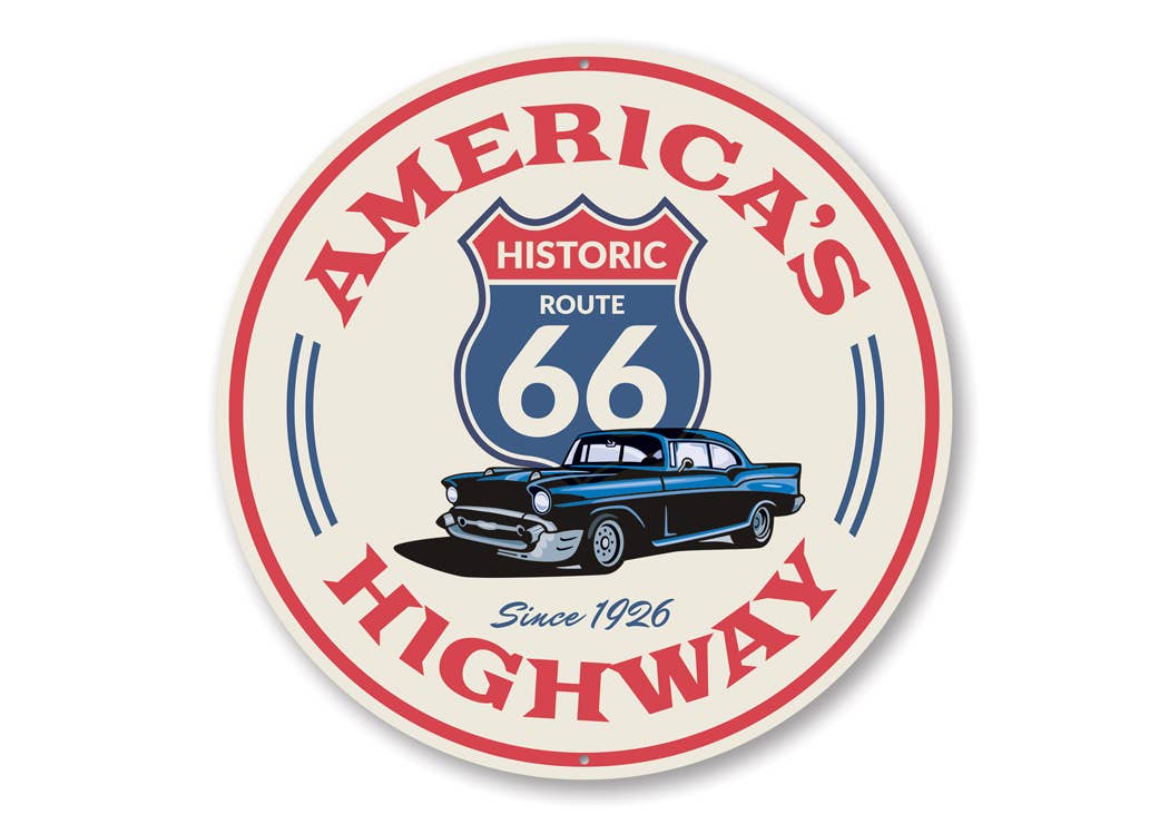Novelty Route 66 Sign with a white background and red letters that read "America's Highway." Also depicted is a blue Route 66 Highway sign and a blue car.
