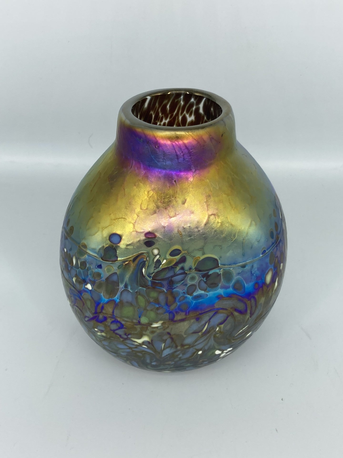 Elaine Hyde masterfully fuses beauty and utility in each of her unique, hand-sculpted glass pieces. This blown glass vase measures 7-8" and is handmade in California. Design may vary slightly per piece.