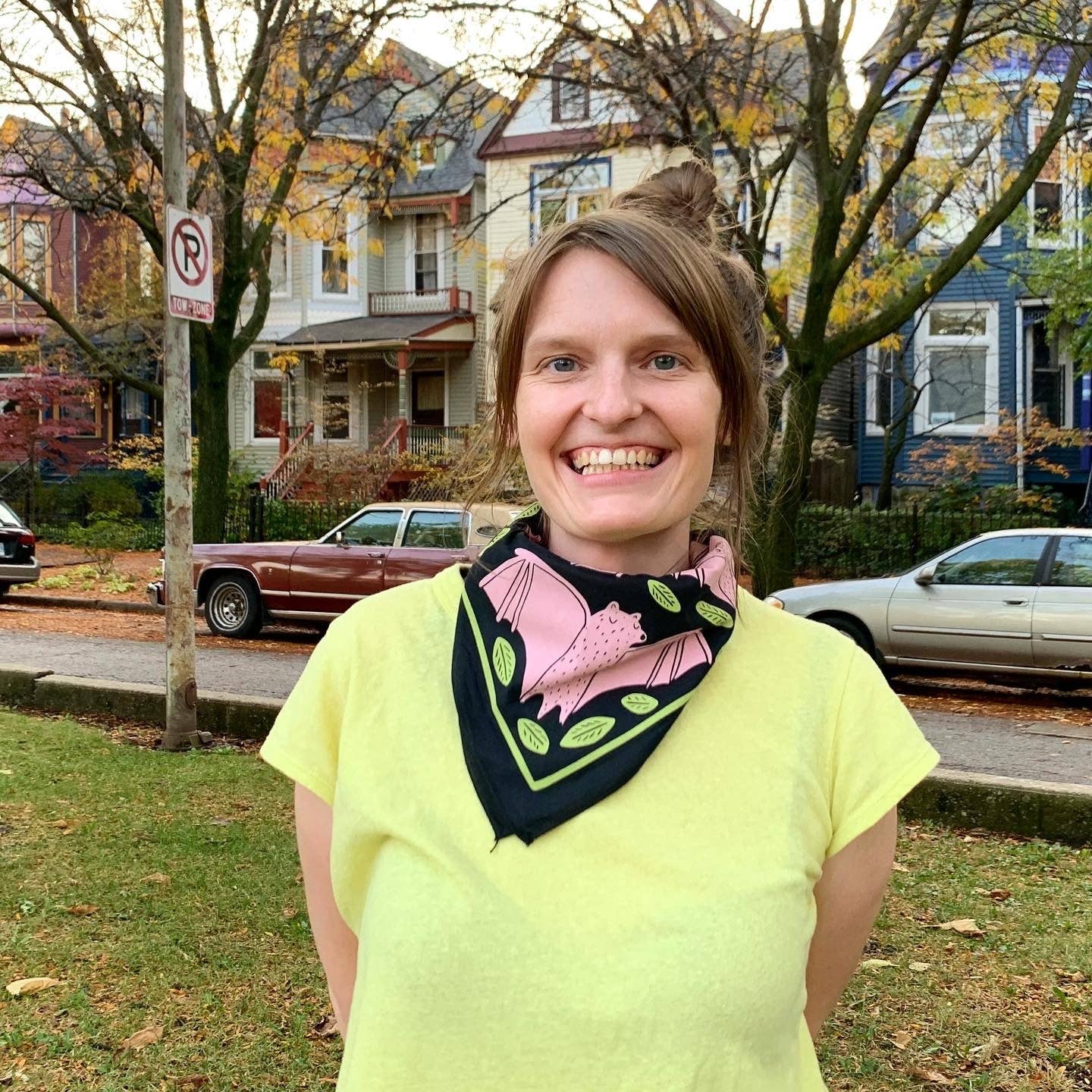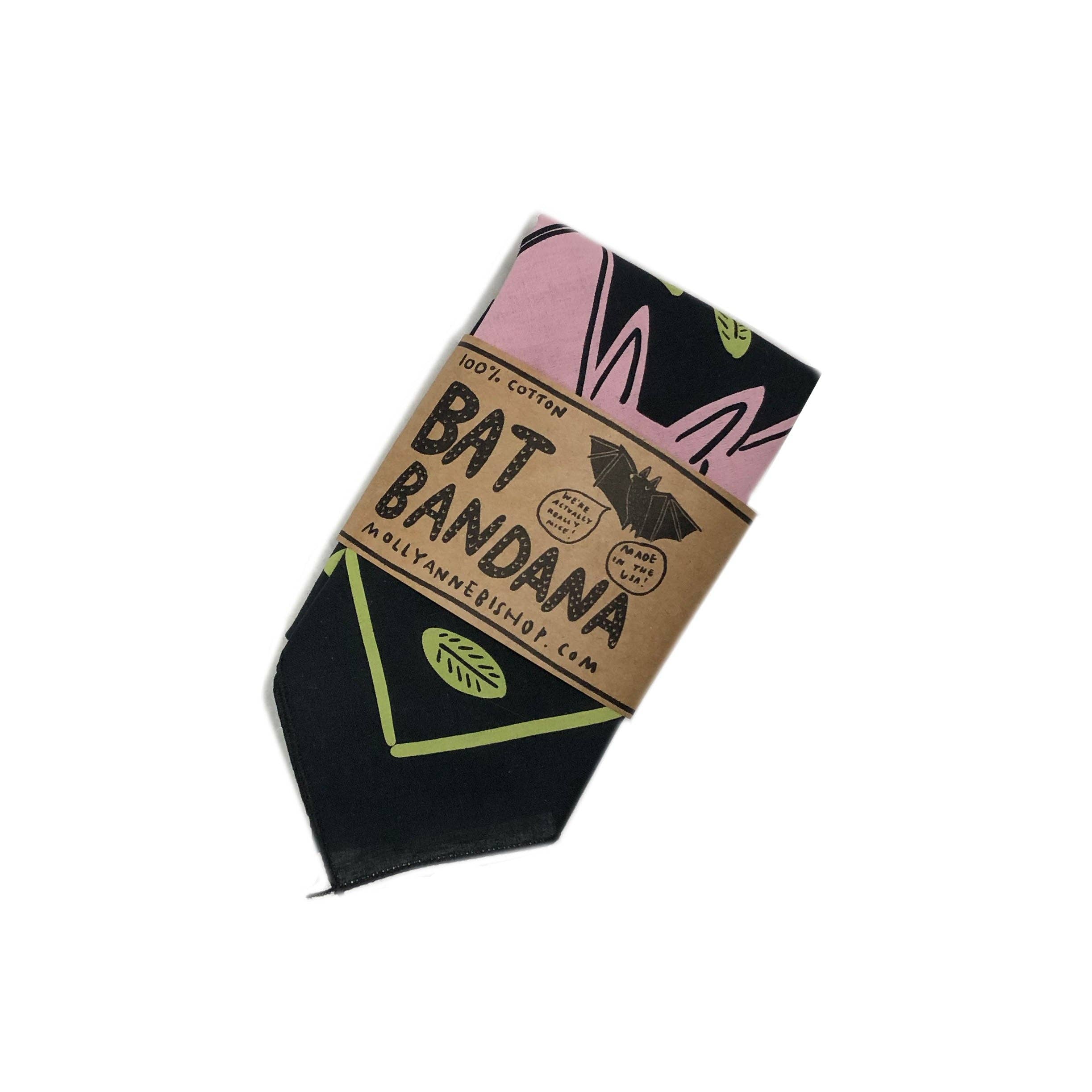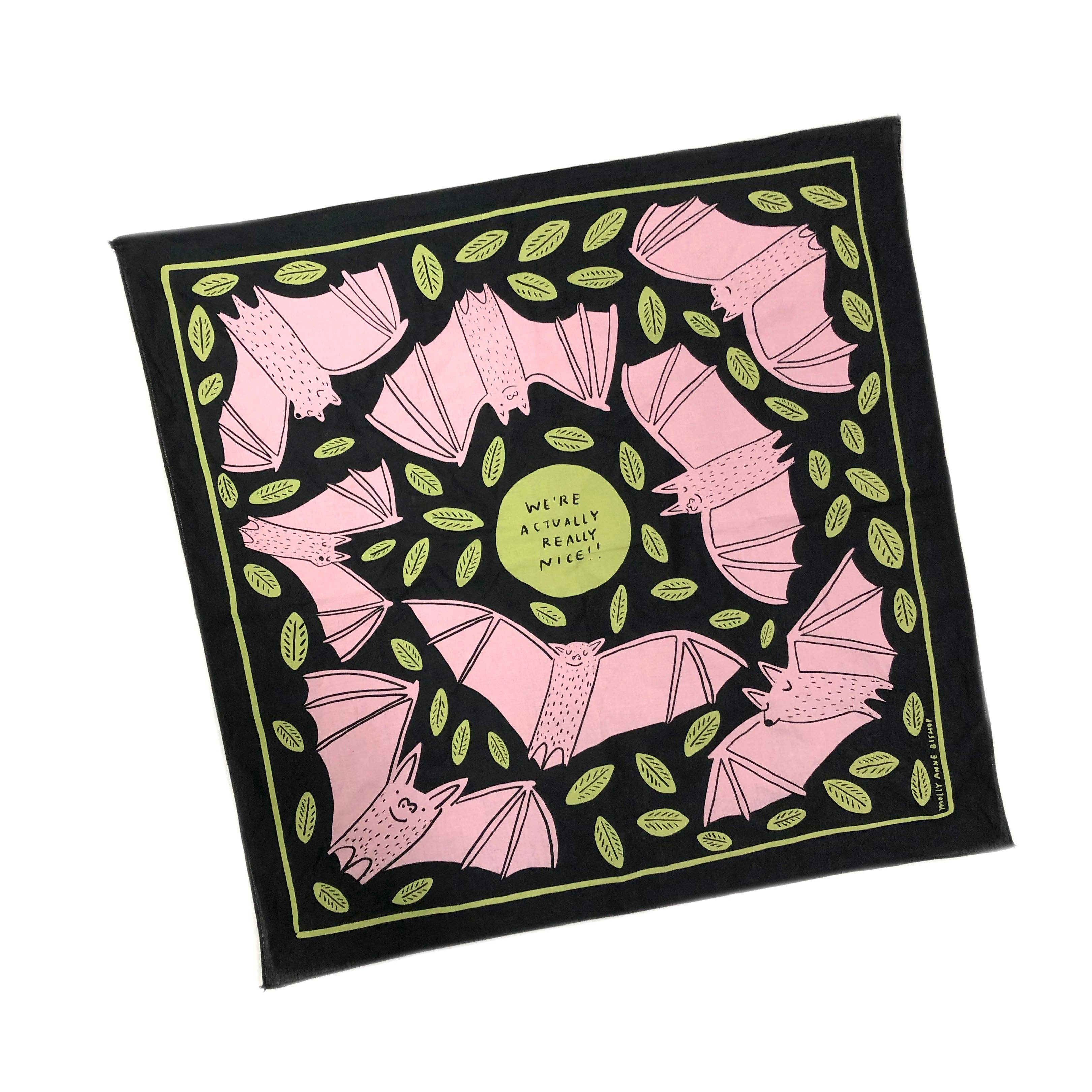 This best-selling bandana is here to remind you that bats are actually really nice! A soft recycled cotton bandana screenprinted with happy cute bats smiling among green leaves. This 22" x 22" cotton bandana was made and printed in the US. Machine washable!