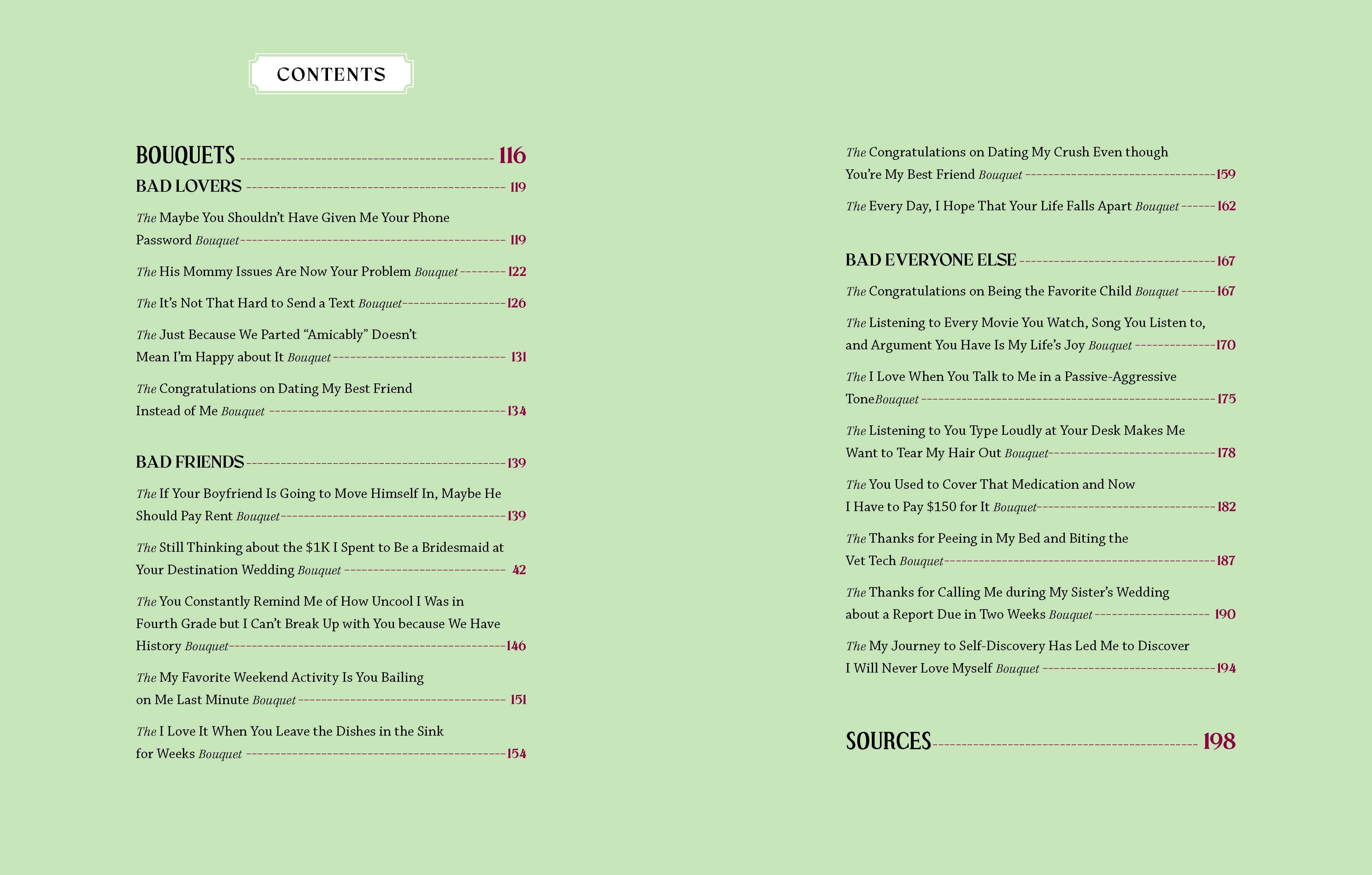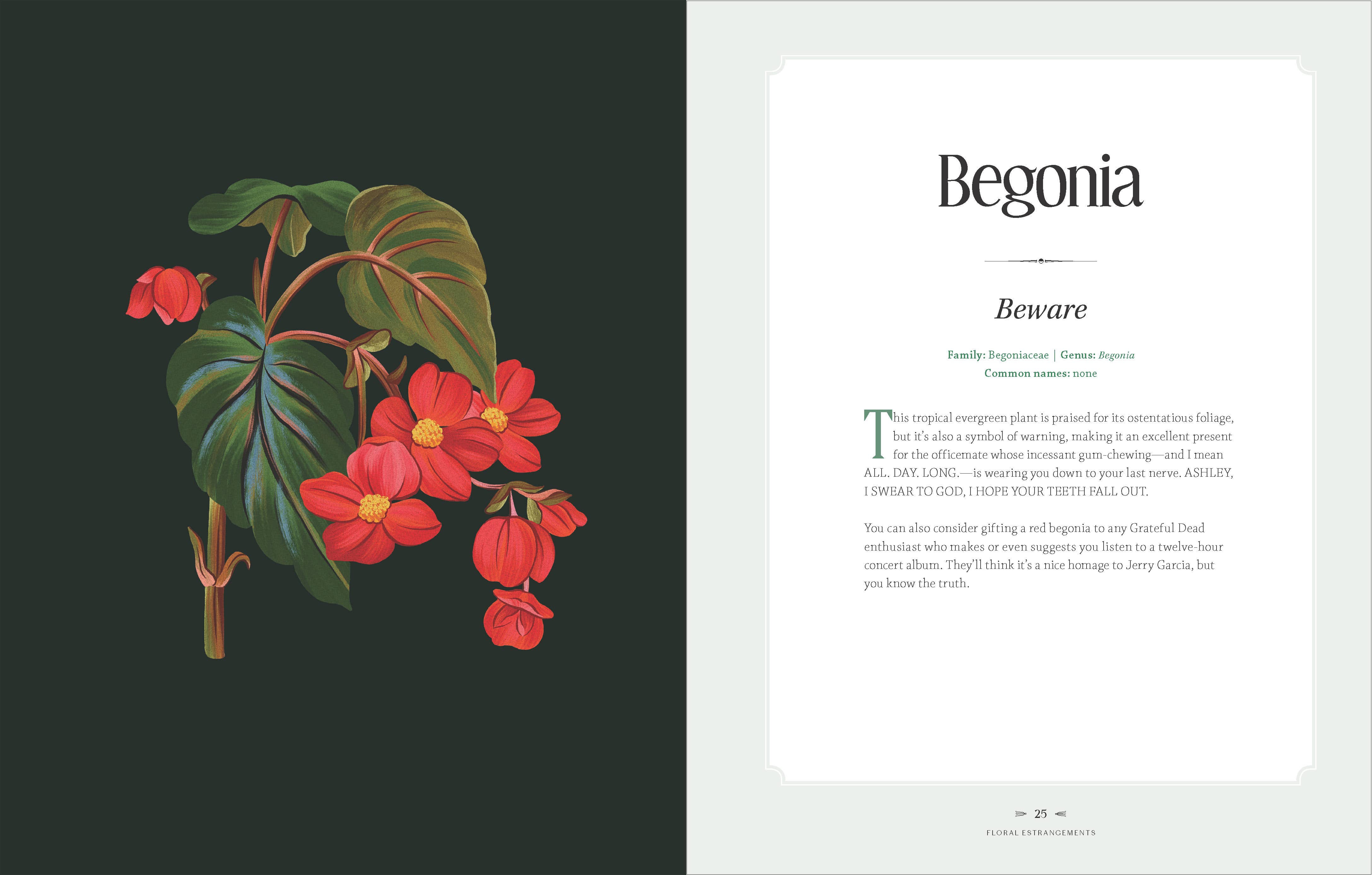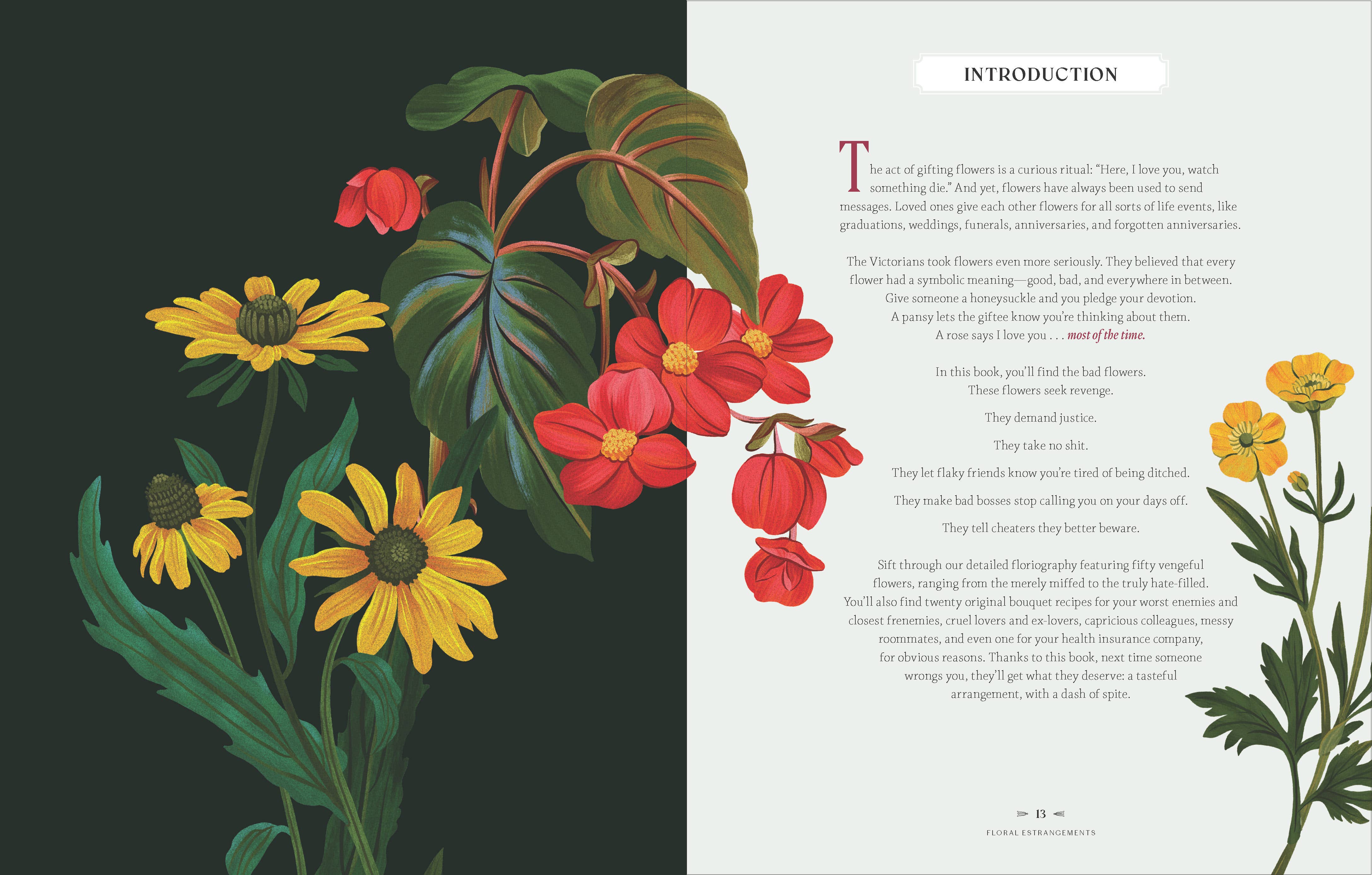 This illustrated floriography will help you choose the perfect Floral Estrangement for your situation, such as: * The âMaybe You Shouldn't Have Given Me Your Phone Passwordâ (Yellow Chrysanthemum, Birdsfoot Trefoil, Basil, Yellow Rose, Tansy) * The âStill Thinking about the $1K I Spent to Be a Bridesmaid at Your Destination Weddingâ (Black-Eyed Susan, Birdsfoot Trefoil, Delphinium, Orange Lily) * The âHis Mommy Issues Are Now Your Problemâ (Withered White Rose, Pine, Delphinium). With incredible, subtly hostile illustrations of flowers throughout, this is a sumptuous, decadent, guilty pleasure of a gift or self-purchase. As a modern bard says, âDonât get sad, get even.