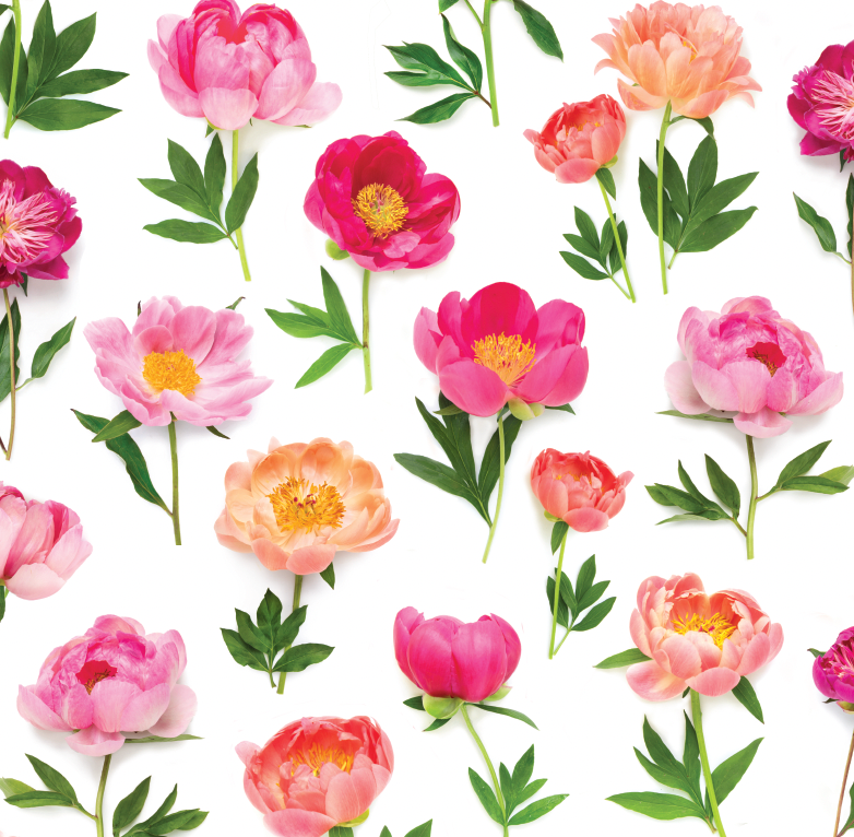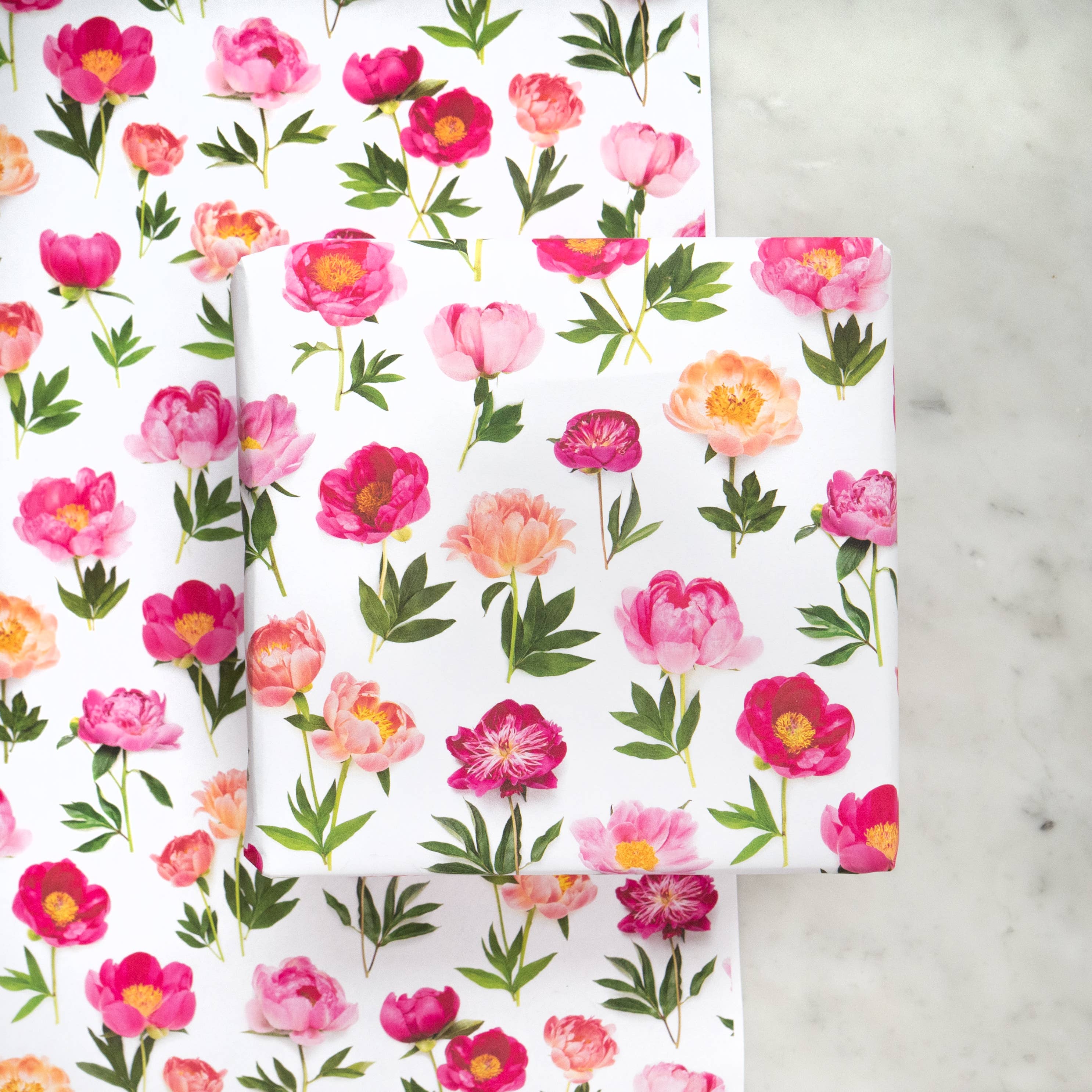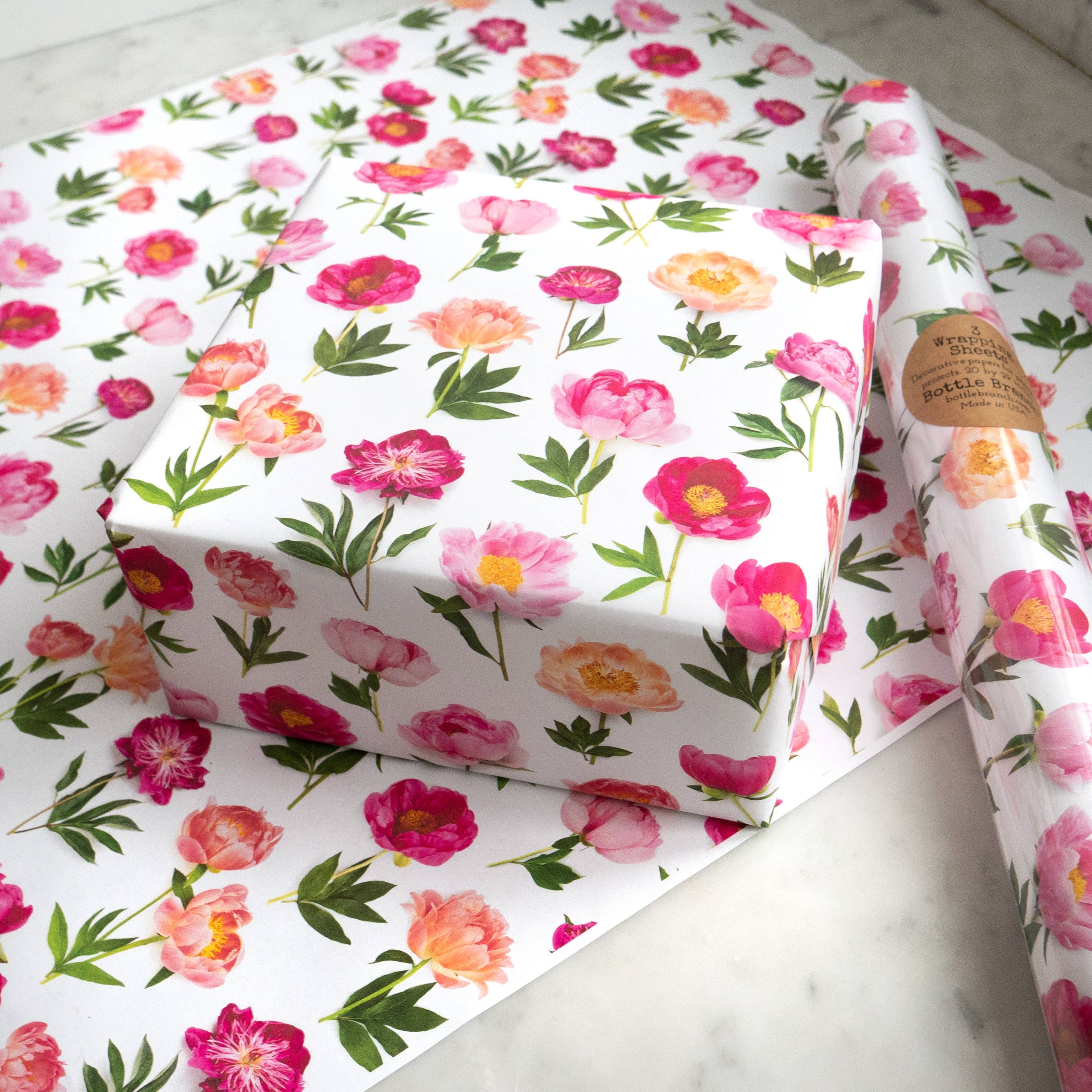 Three sheets of decorative paper, printed in big peony flowers. Created from photographs of fresh plant material, these designs pop off the paper and bring your package to life.