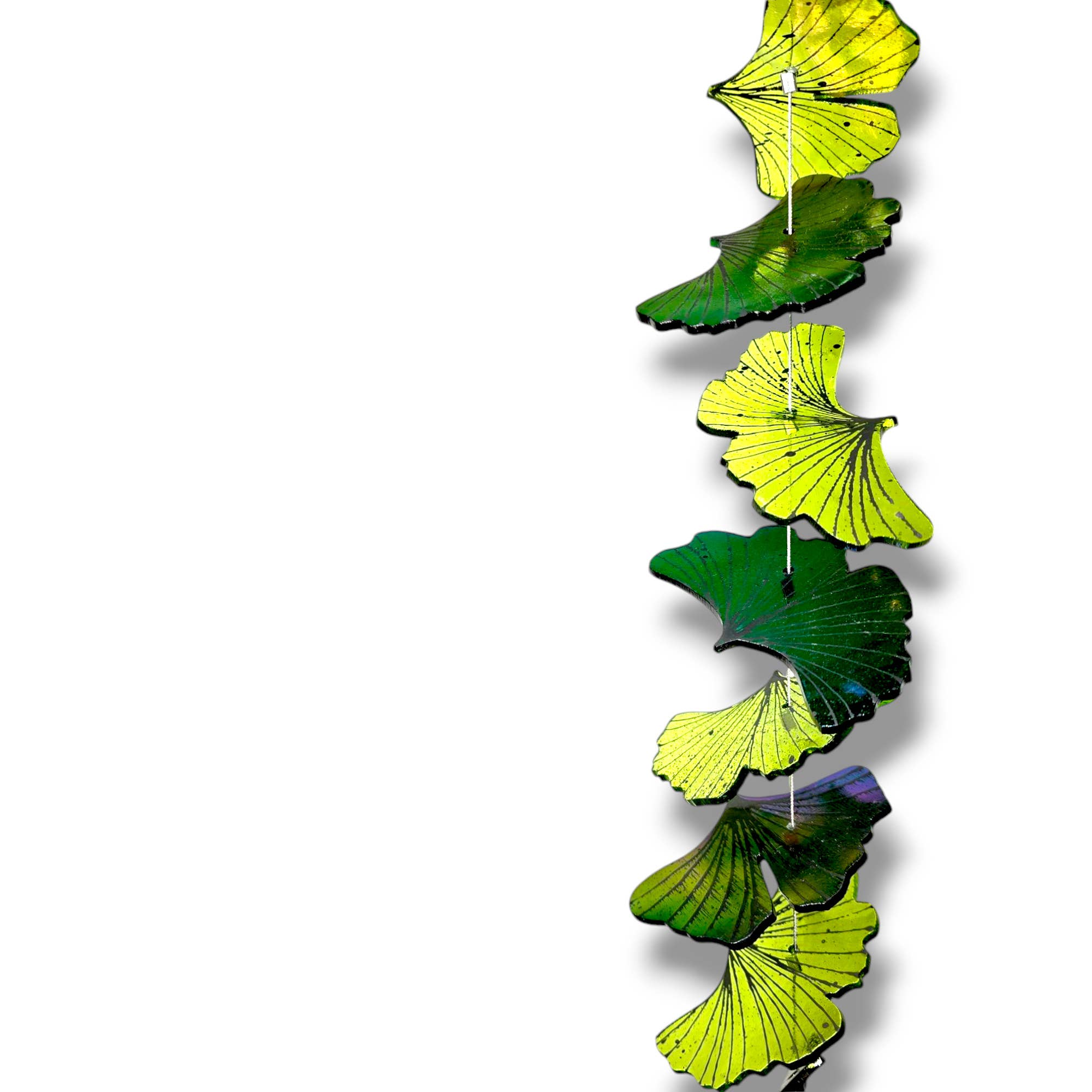 Pale chartreuse paired with deep, dark iridized glass that flashes emerald greens creates a bold and captivating design, highlighting the iconic fan-like forms of Ginkgo leaves. Each glass leaf is meticulously hand-painted and kiln-fired, ensuring vibrant, lasting beauty that won’t fade or scratch. The leaves are shaped through a specialized firing and slumping process, creating unique, organic forms.