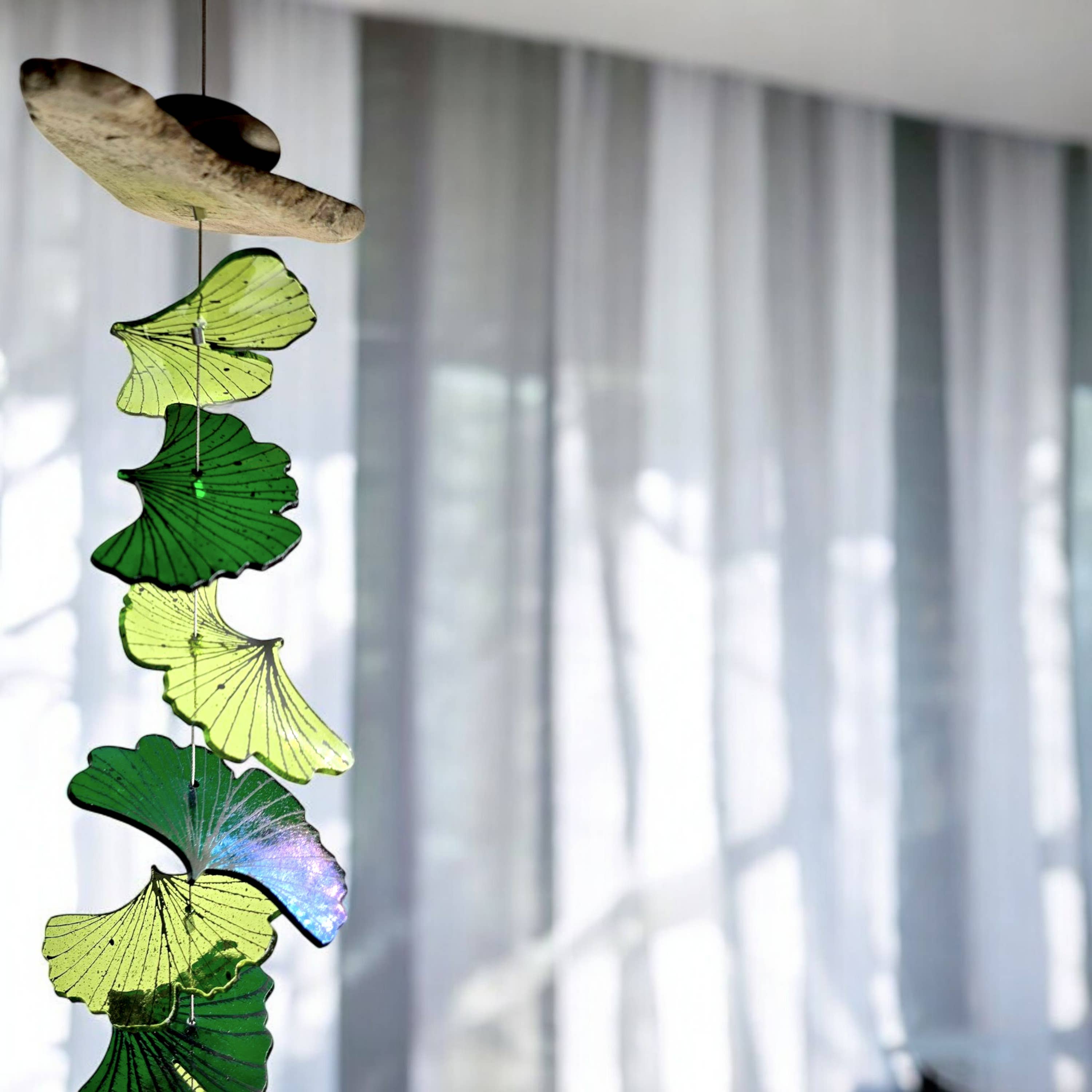 Pale chartreuse paired with deep, dark iridized glass that flashes emerald greens creates a bold and captivating design, highlighting the iconic fan-like forms of Ginkgo leaves. Each glass leaf is meticulously hand-painted and kiln-fired, ensuring vibrant, lasting beauty that won’t fade or scratch. The leaves are shaped through a specialized firing and slumping process, creating unique, organic forms.