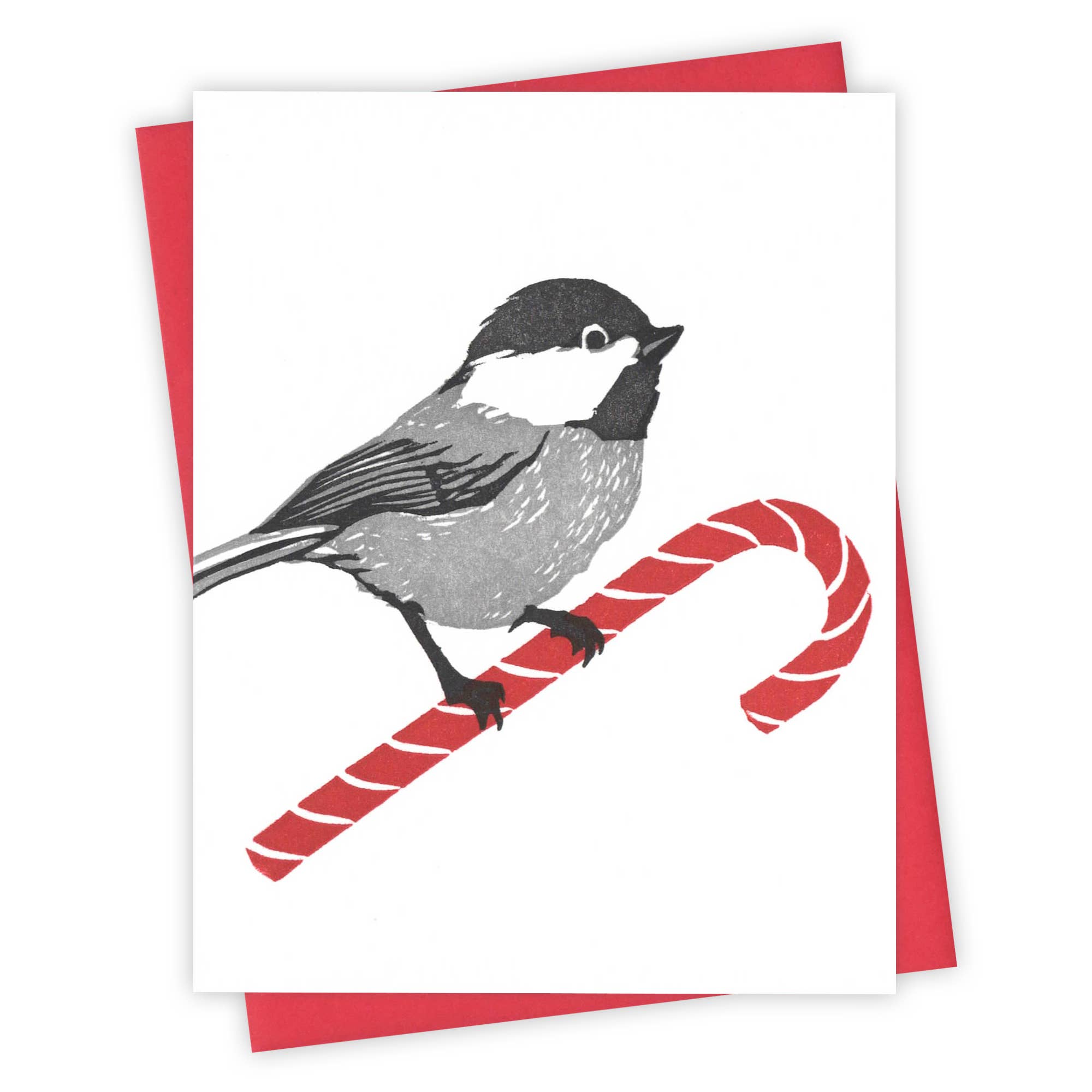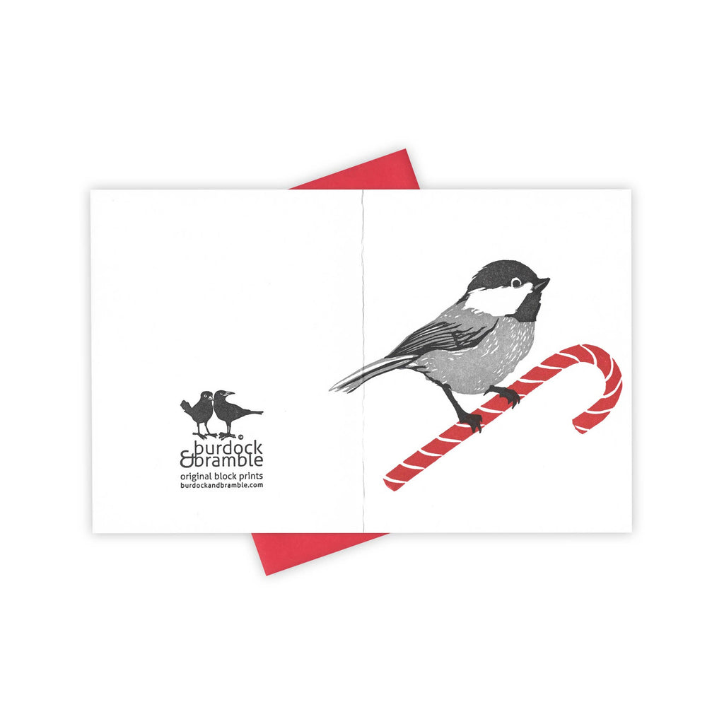 Original block print folded card on 100% cotton paper featuring a hand-carved, letterpress-printed chickadee holding a striped red candy cane.