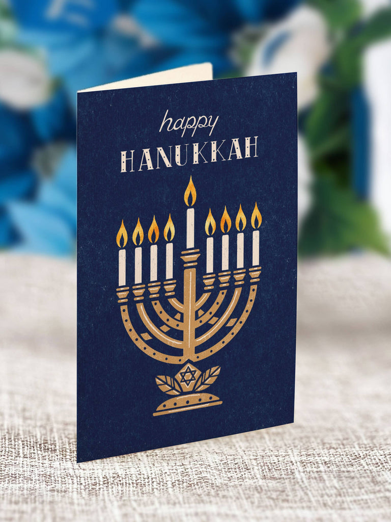 Gather with your loved ones to decorate this dazzling Hanukkah bouquet as a lasting tribute to the festival of lights. A traditional menorah, dreidel, and Star of David trim a bold array of blue and white flowers alongside an opulent satin bow. Perfect for Hanukkah!