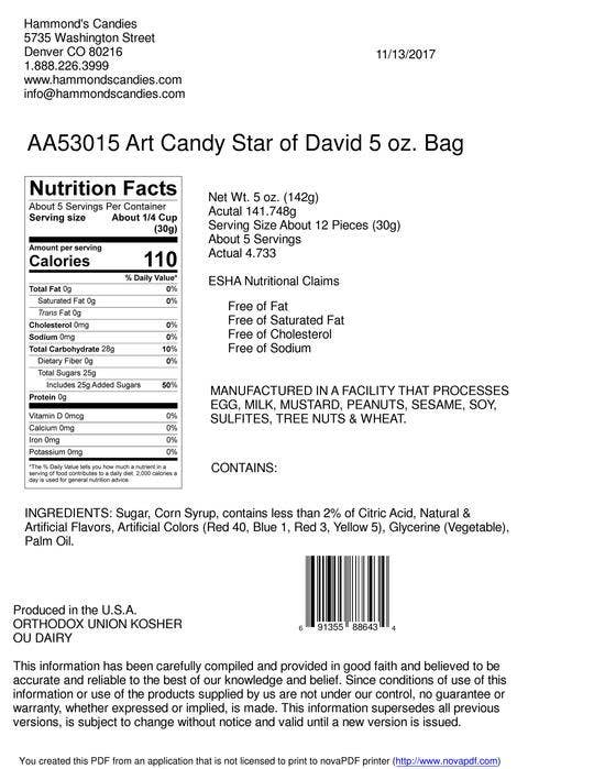 Hammond’s Star of David Blueberry Art Candy brings joyful flavor and handcrafted beauty to Hanukkah and Simcha gatherings alike. Each 5 oz gift bag features vibrant blueberry-flavored hard candy pieces, carefully shaped with the iconic Star of David to honor tradition and elevate the celebration. OU-D kosher and sodium-free, these artisanal treats are perfect for gifting, party favors, and impulse bins. They are also perfect for Hanukkah displays, Simcha tables, and seasonal assortments.