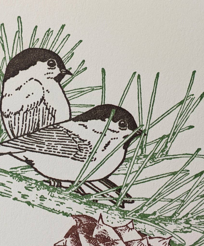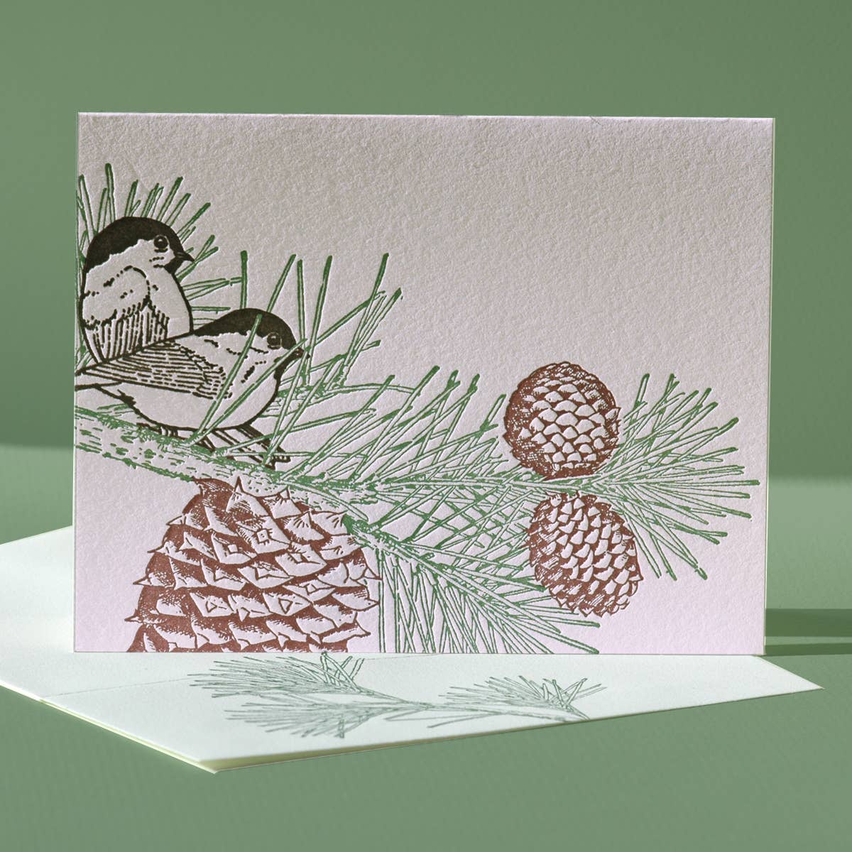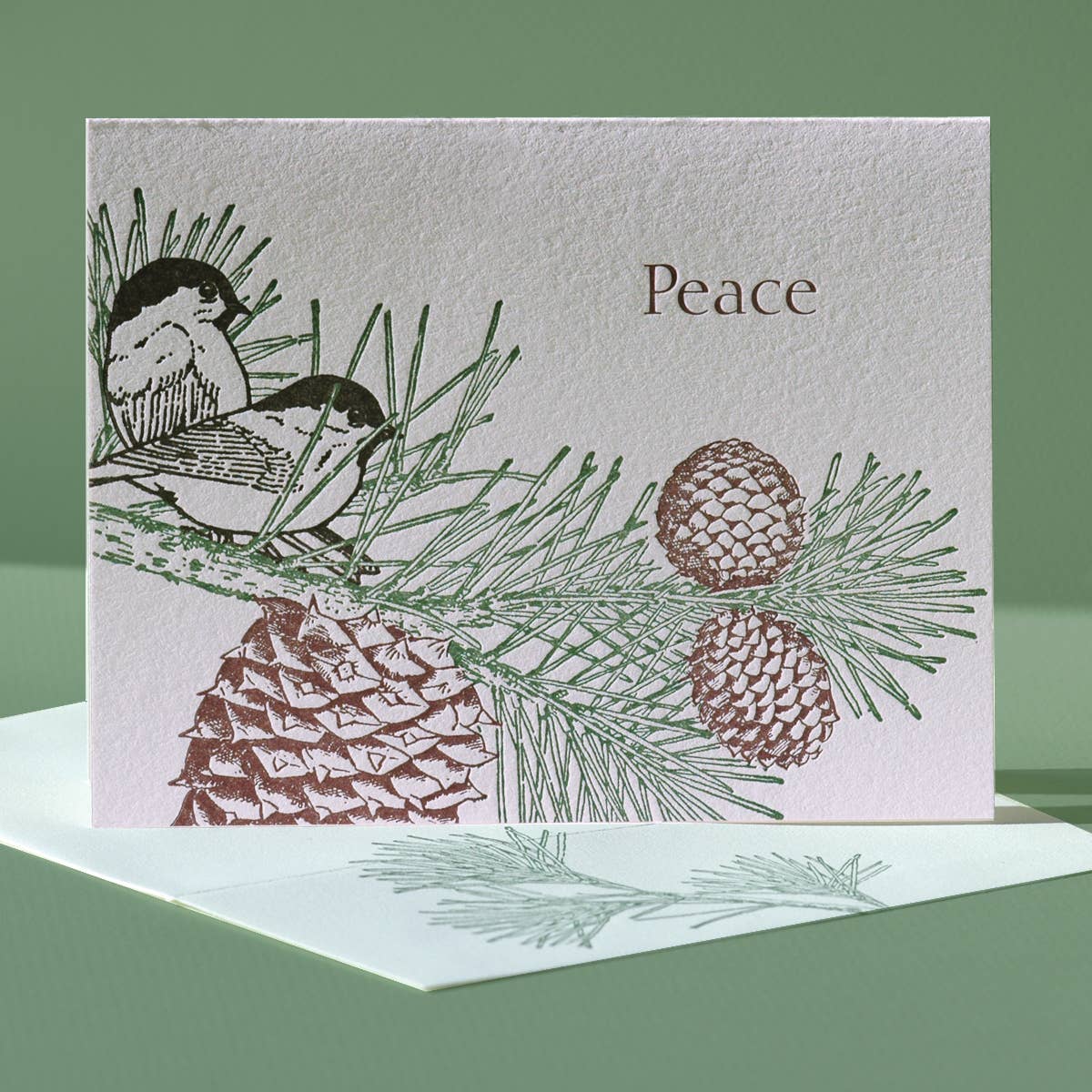 The long branch of a table mountain pine spreads outward, sheltering two chickadees among its sturdy cones and bright bundles of needles. Although this pine is an East Coast native, feel free to extend some peace outside its range this holiday season.