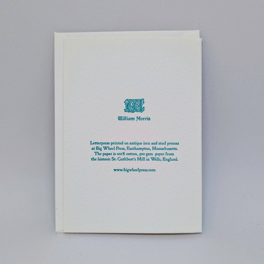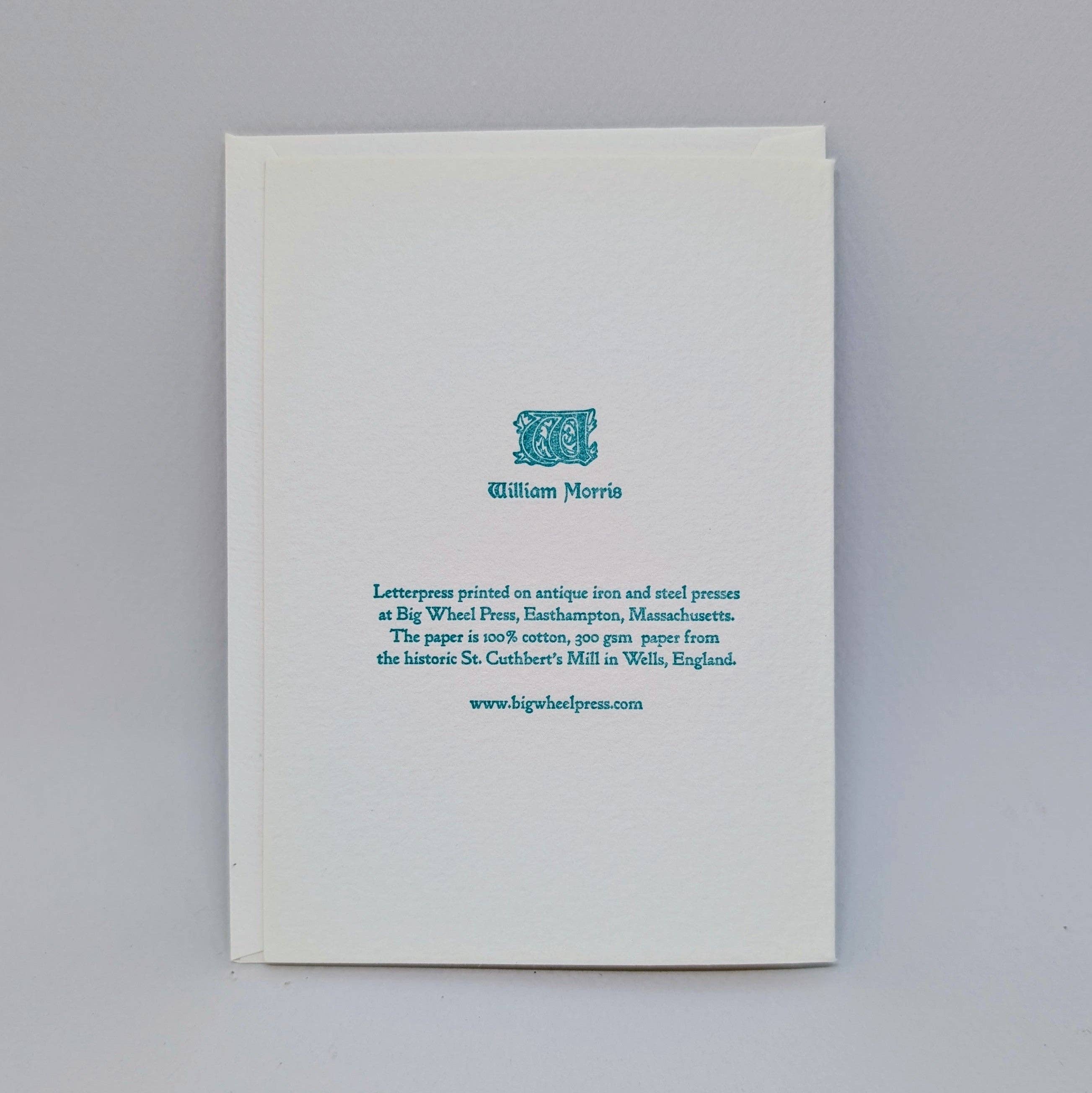 Letterpress printed on antique iron and steel presses at Big Wheel Press, Easthampton, Massachusetts. The paper is 100% cotton, 300 gsm paper from the historic St. Cuthbert's Mill in Wells, England.