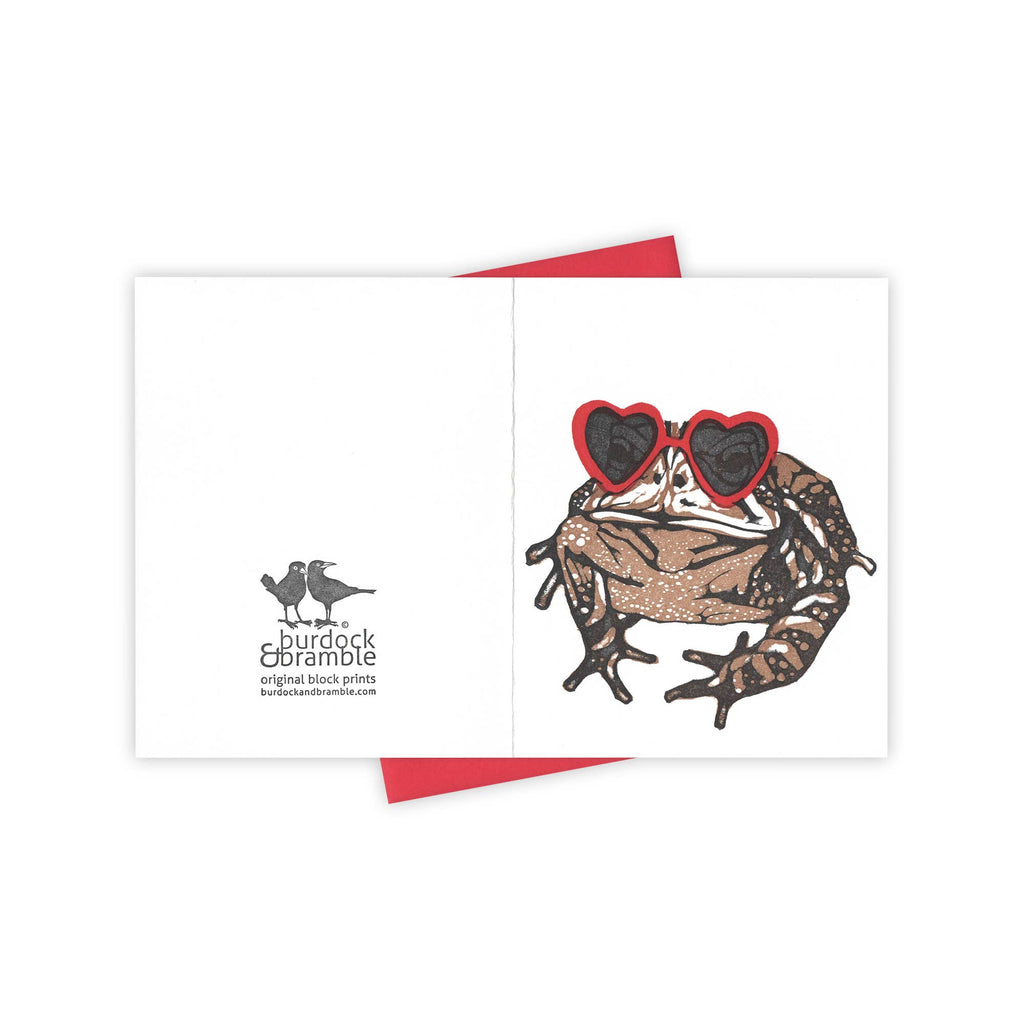 Original block print folded card on 100% cotton paper featuring a hand-carved, letterpress-printed toad sporting stylish heart-shaped glasses.