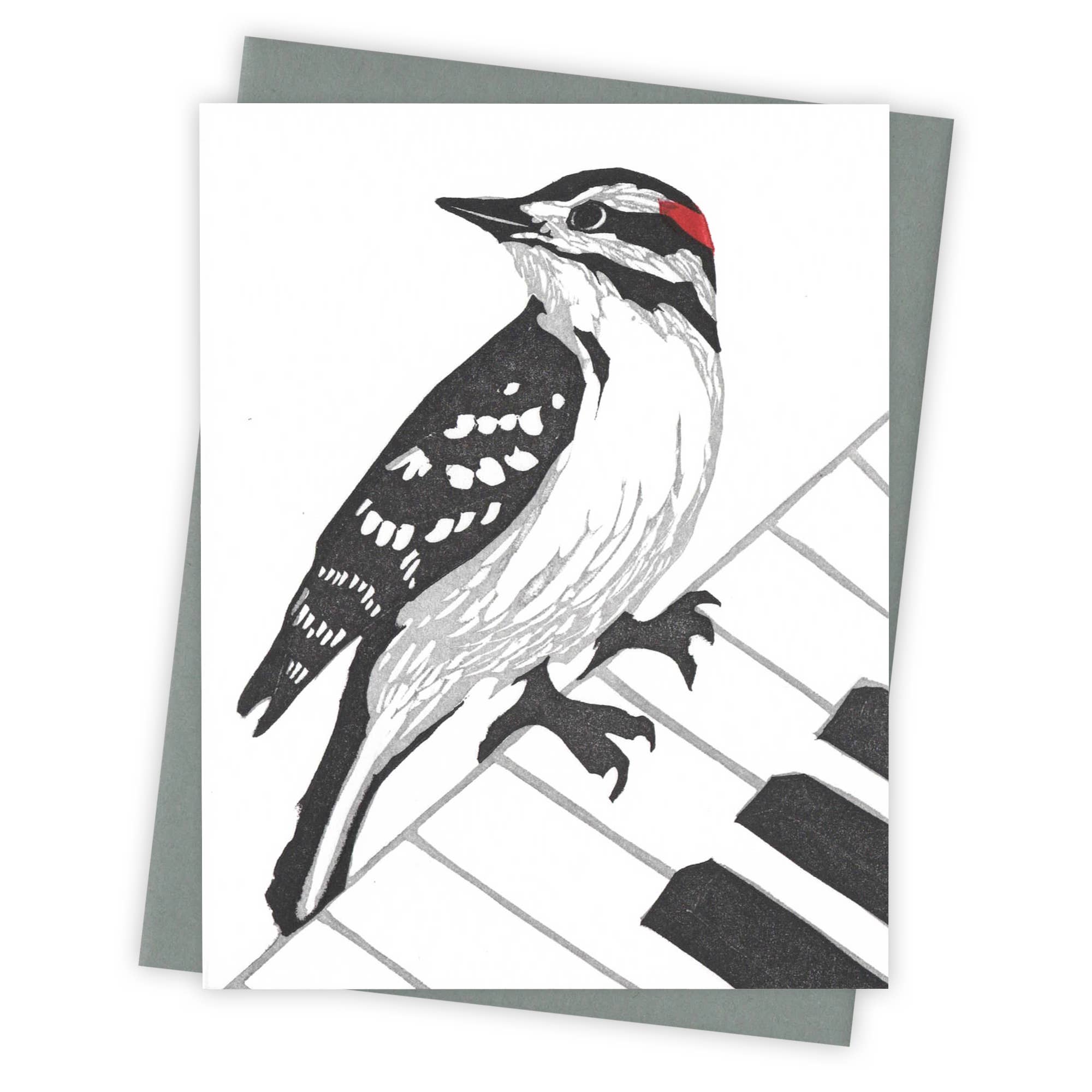 Original block print folded card on 100% cotton paper featuring a hand-carved, letterpress-printed woodpecker poised to play the piano.