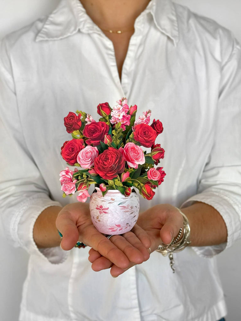 Effortlessly charming, the Mini Blooming Rose Bouquet is a burst of garden roses and snapdragons, shimmering in soft shades of pink and red—a little pop of color that’s big on beauty. This mini rose pop-up card and bouquet is a perfect mini romantic card for anniversaries, birthdays, or just because. Nestled in an ornate watercolor crackle vase, it’s a small floral pop-up that makes a big impression. A timeless gesture, this card is sure to brighten anyone’s day.