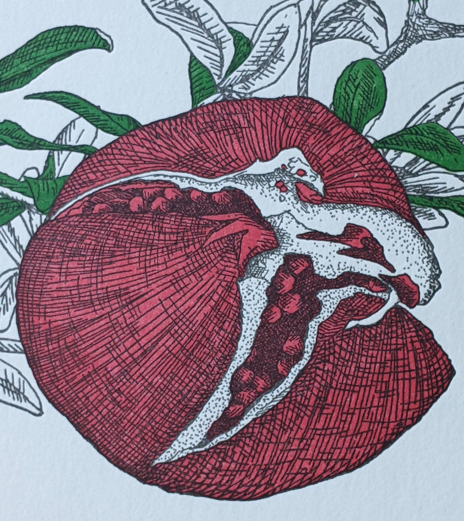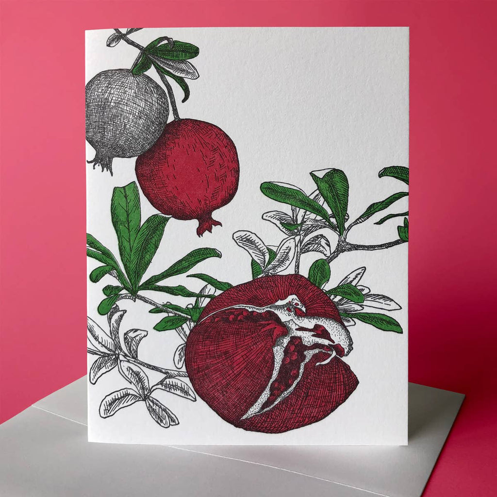 Open pomegranates often symbolism abundance and plenty; send a kind wish of peace this holiday season. Outside reads "wishing you peace & plenty," inside is blank.
