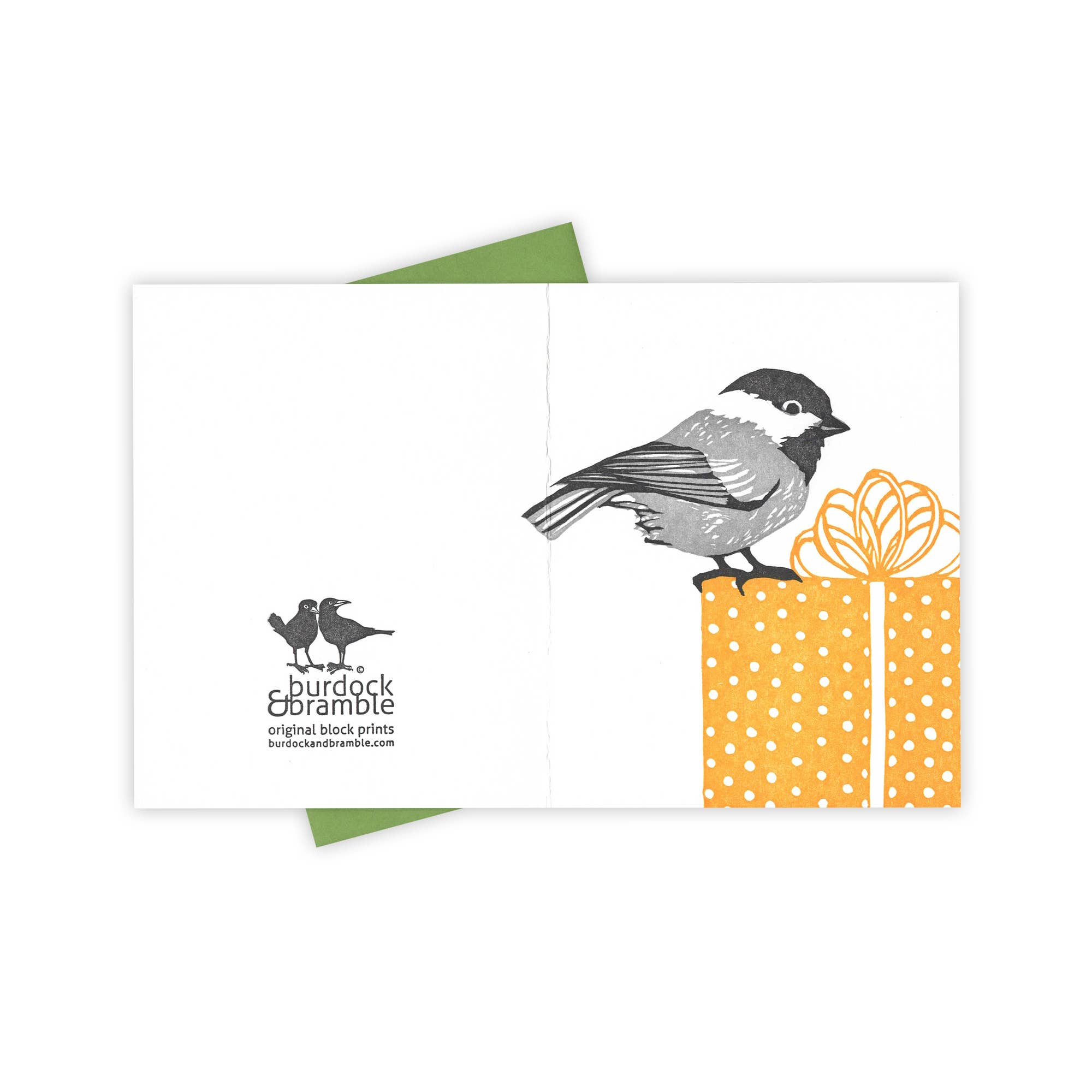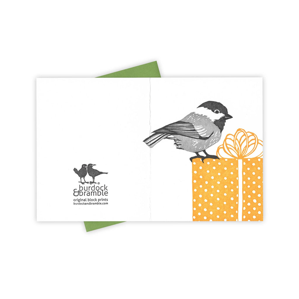 Original block print folded card on 100% cotton paper featuring a hand-carved, letterpress-printed chickadee perched atop a wrapped gift with an orange bow.