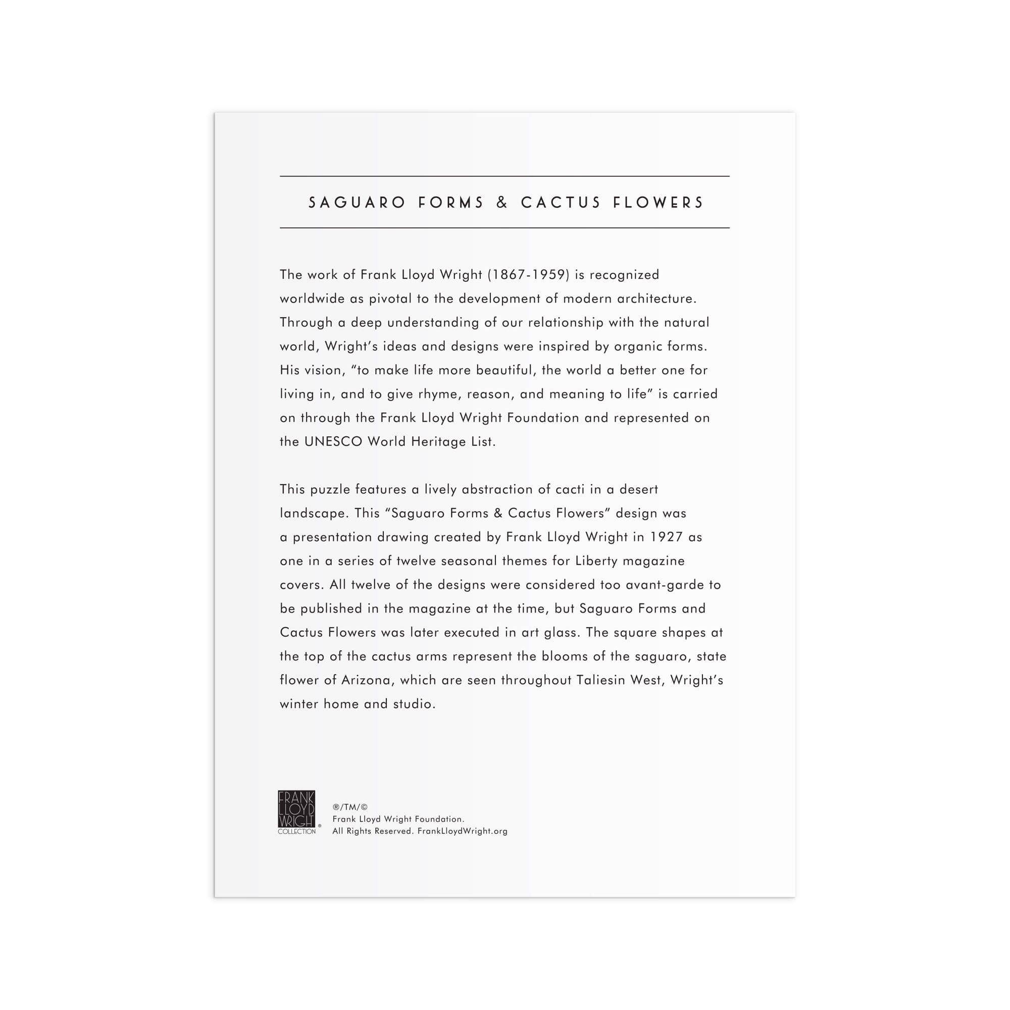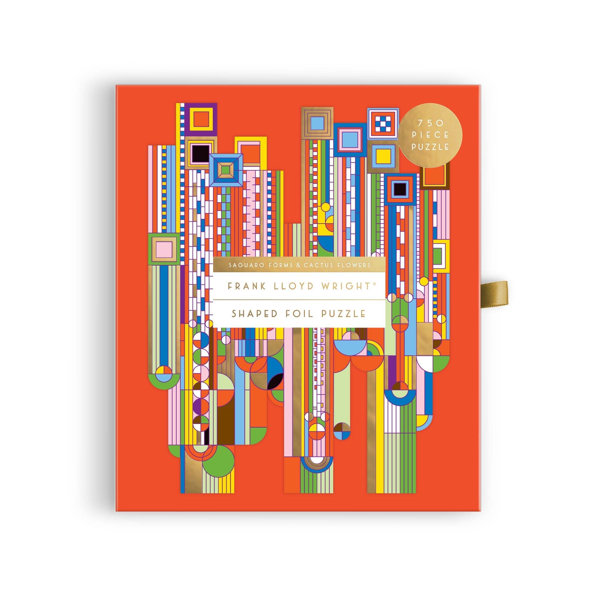 Explore architectural brilliance with the Frank Lloyd Wright Saguaro Cactus & Forms puzzle, a 750-piece shaped foil masterpiece. This distinctive puzzle honors Wright's iconic design philosophy, merging organic desert imagery with geometric abstraction through shimmering foil accents. The non-traditional shaped pieces create an engaging assembly experience while the reflective foil elements enhance the composition's visual sophistication. The completed puzzle becomes a gallery-worthy art piece that reflects light beautifully, making it an exceptional display for those who appreciate both artistic vision and innovative puzzle design.