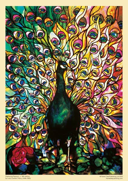 Louis Comfort Tiffany was an American artist and designer who worked in the decorative arts. Throughout his career he forged a unique style that combined excellent craftsmanship with a love of nature forms and brilliant colour. Though he worked with a multitude of mediums, he is best known for his work in stained glass. This beautiful design pairs Tiffany’s most famous medium with his favourite motif: the peacock. Peacock feathers featured countless times in both his personal life and his professional career.