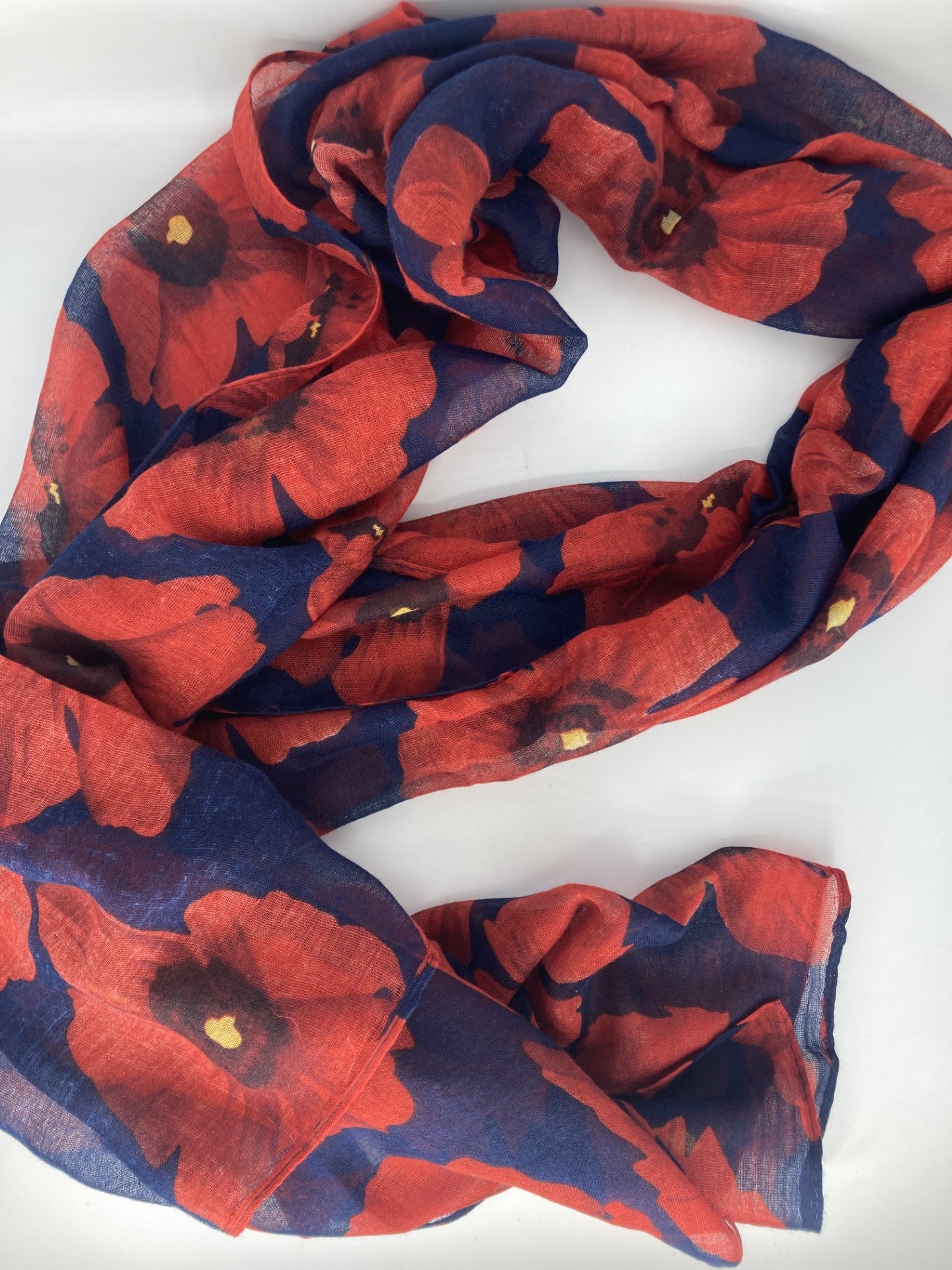 This vibrant Poppy Scarf is made from lightweight polyester, perfect for adding a touch of elegance to any outfit. Featuring bold red poppies set against your choice of a navy or white background, this scarf commemorates the beauty and symbolism of the beloved flower. Ideal for year-round wear, it brings a striking pop of color and a timeless, meaningful design to your wardrobe, making it a versatile accessory that celebrates both nature and style.Ā