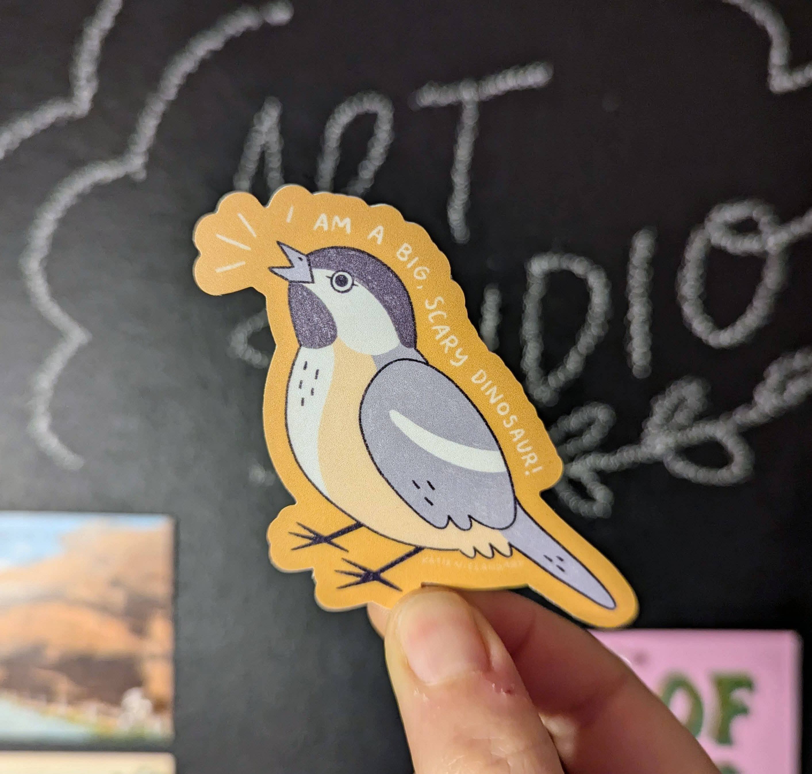 3" waterproof, vinyl sticker featuring a black-capped chickadee (a bird found across the country) and the words "I AM A BIG, SCARY DINOSAUR." While this references birds' prehistoric origins, the idea is that even a little tiny chickadee can be brave! Mustard yellow background and hand-written text.