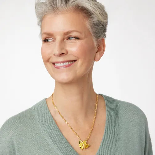 The radiant bloom on this necklace is plucked from the "Daffodil" lamp produced by Tiffany Studios (American, 1902–32) around 1904–10. The daffodil appears to have been a popular Tiffany Studios subject over several decades, and archival photographs of the studio show real daffodils arranged on model shades, demonstrating how closely the artisans worked from nature. Now in The Met's American Wing, the lamp exhibits Louis C. Tiffany's (American, 1848–1933) enduring reverence for the natural world.