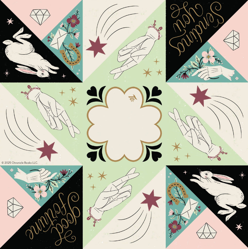 Each card tucks together cleverly to create a small purse or pocket to enclose a charm and any small treasureālike a pressed flower or meaningful stickerāas a token of the sender's affection.
