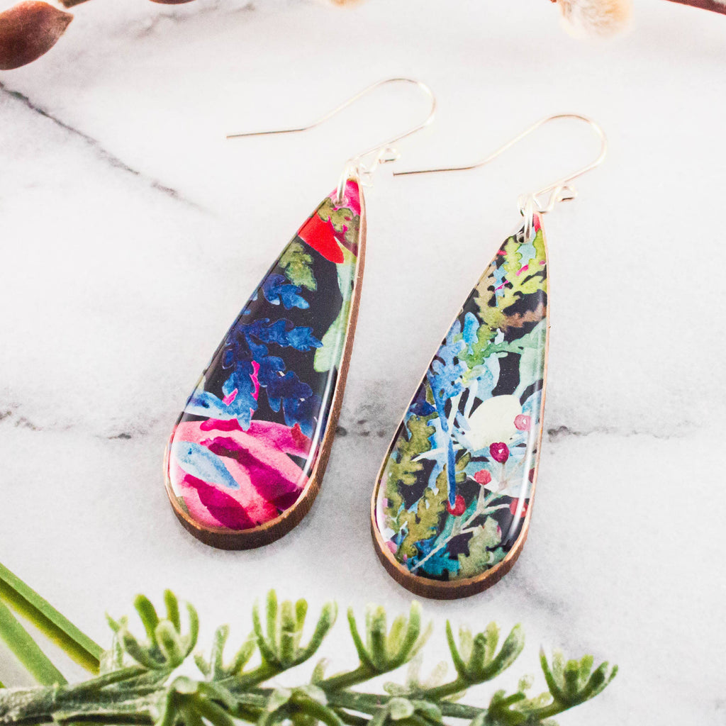 Handcrafted from sustainably harvested maple wood, handmade papers sourced from Europe, glossy, vegetable-based resin, and handcrafted sterling silver ear wires.
