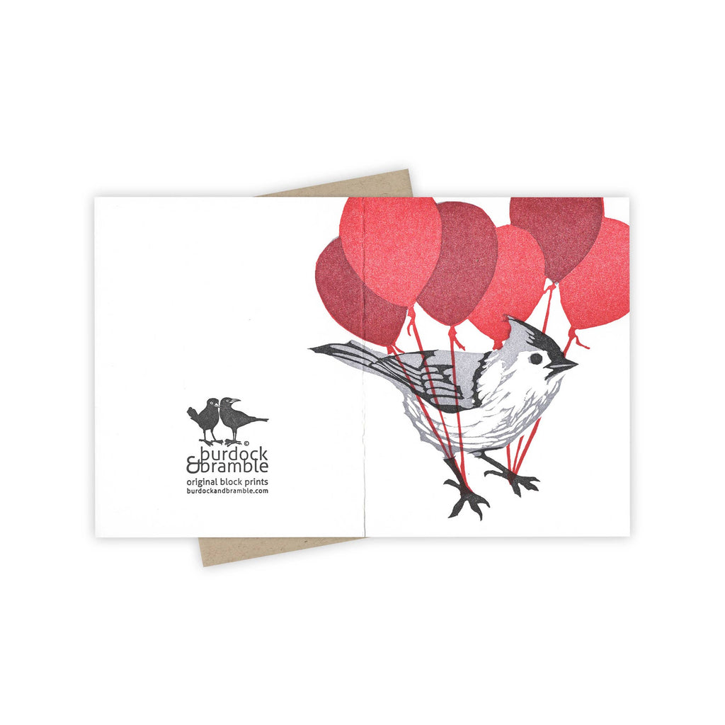 Original block print folded card on 100% cotton paper featuring a hand-carved, letterpress-printed titmouse about to be carried away by a bunch of red balloons.