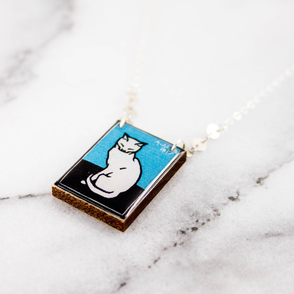 This unique necklace is made from a lovely vintage linocut illustration featuring a delightful cat. Mounted to ethically sourced maple wood, and sealed with glossy soy-based (BPA/VOC free) resin. 18" polished silver plated chain and disc detail.